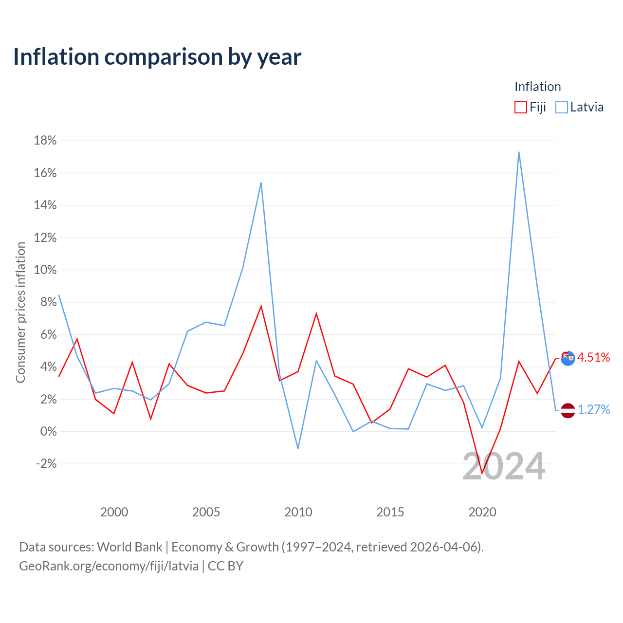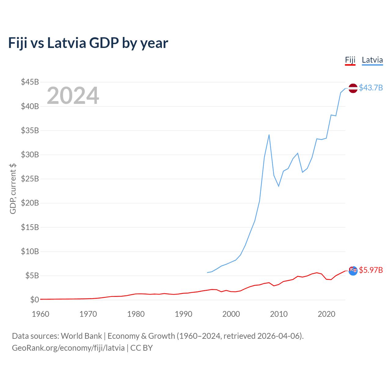 Fiji has a GDP of $5.97B compared to $43.7B for Latvia, ranking 161/197 and 99/197 by economy size, respectively.