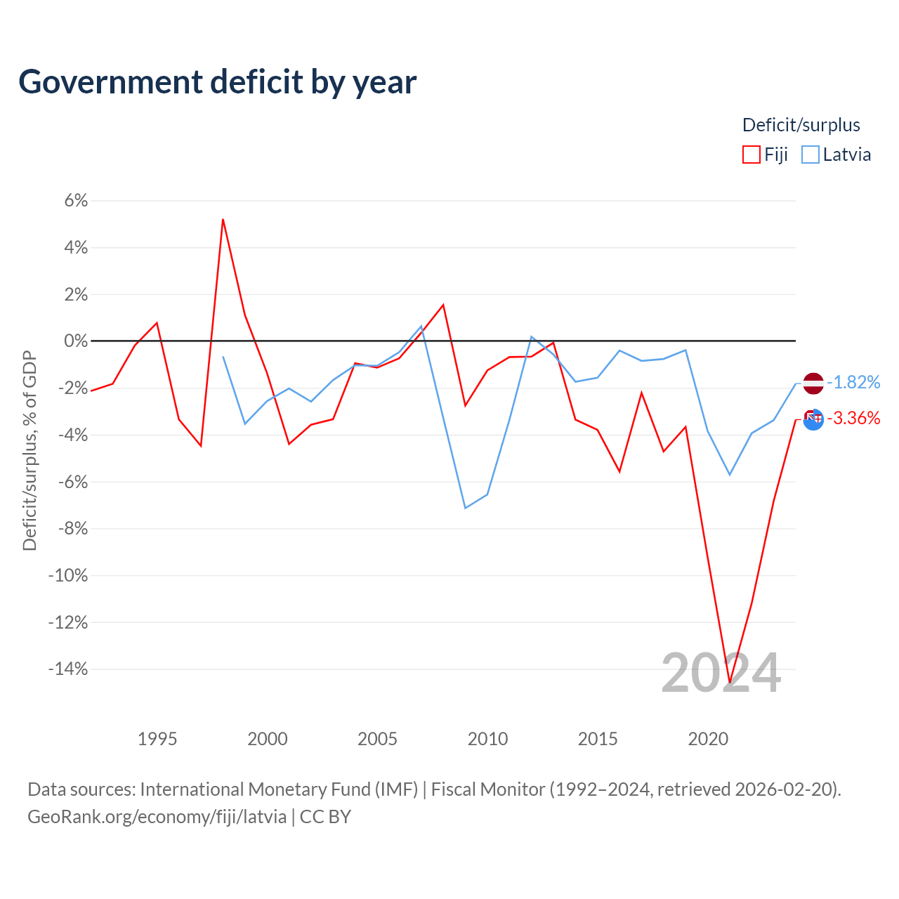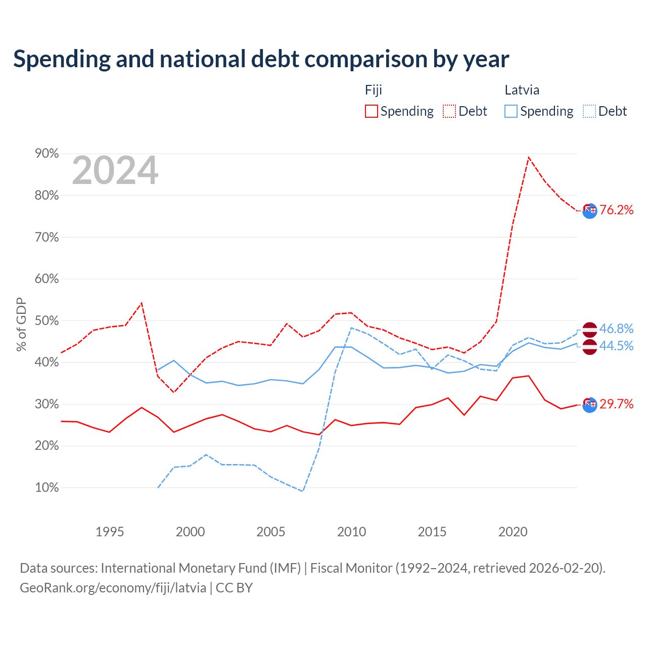 Fiji has $4.54B in government debt (76.2% of GDP), compared to $20.4B (46.8% of GDP) in Latvia.