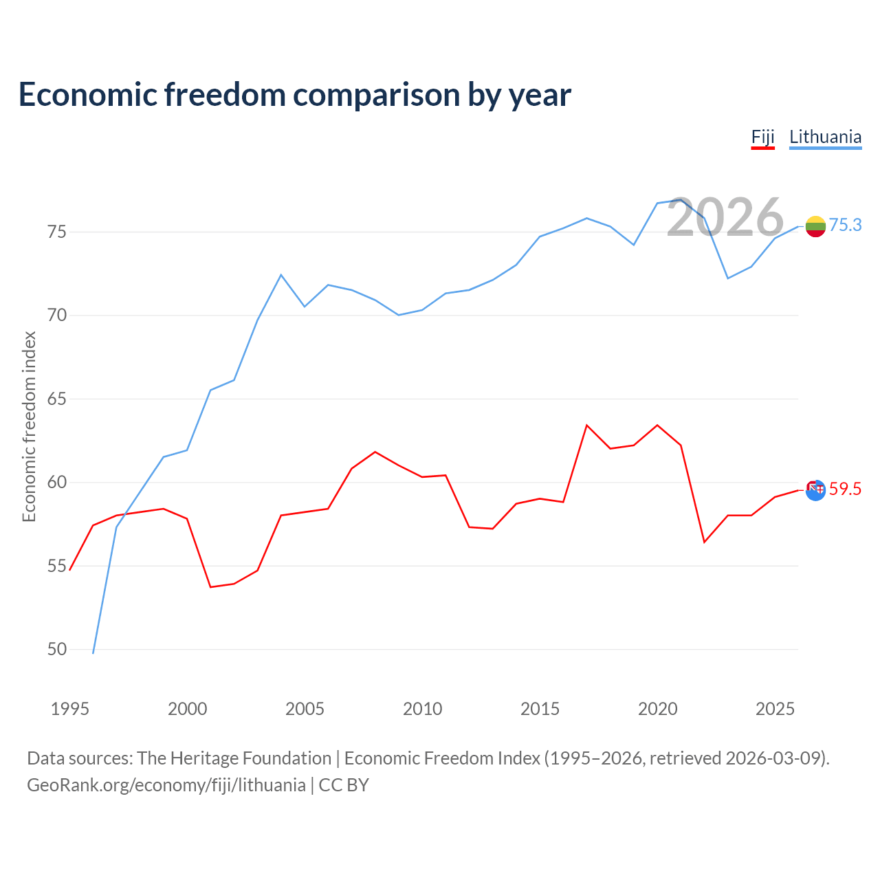 The Economic Freedom Index for Fiji is 59.5, ranking 103/197, compared to 75.3 for Lithuania, ranking 18/197. The chart above displays a comparison of annual changes in economic freedom indexes.