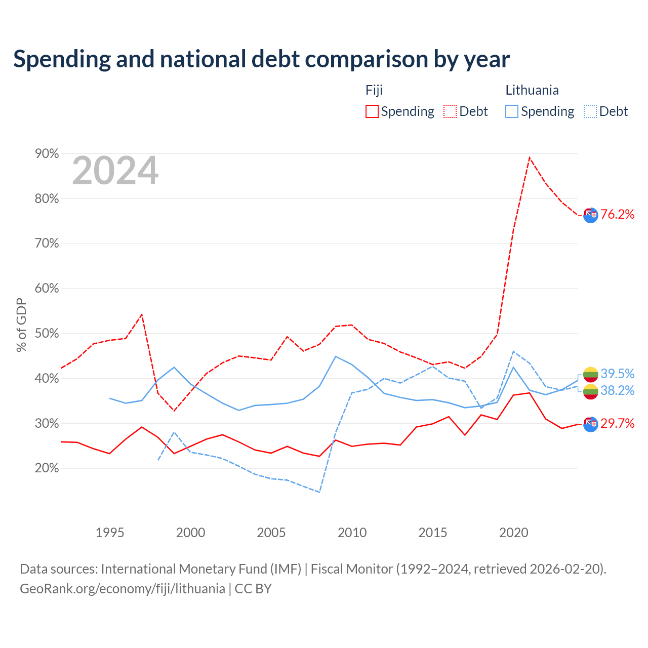 Fiji has $4.54B in government debt (76.2% of GDP), compared to $32.4B (38.2% of GDP) in Lithuania.