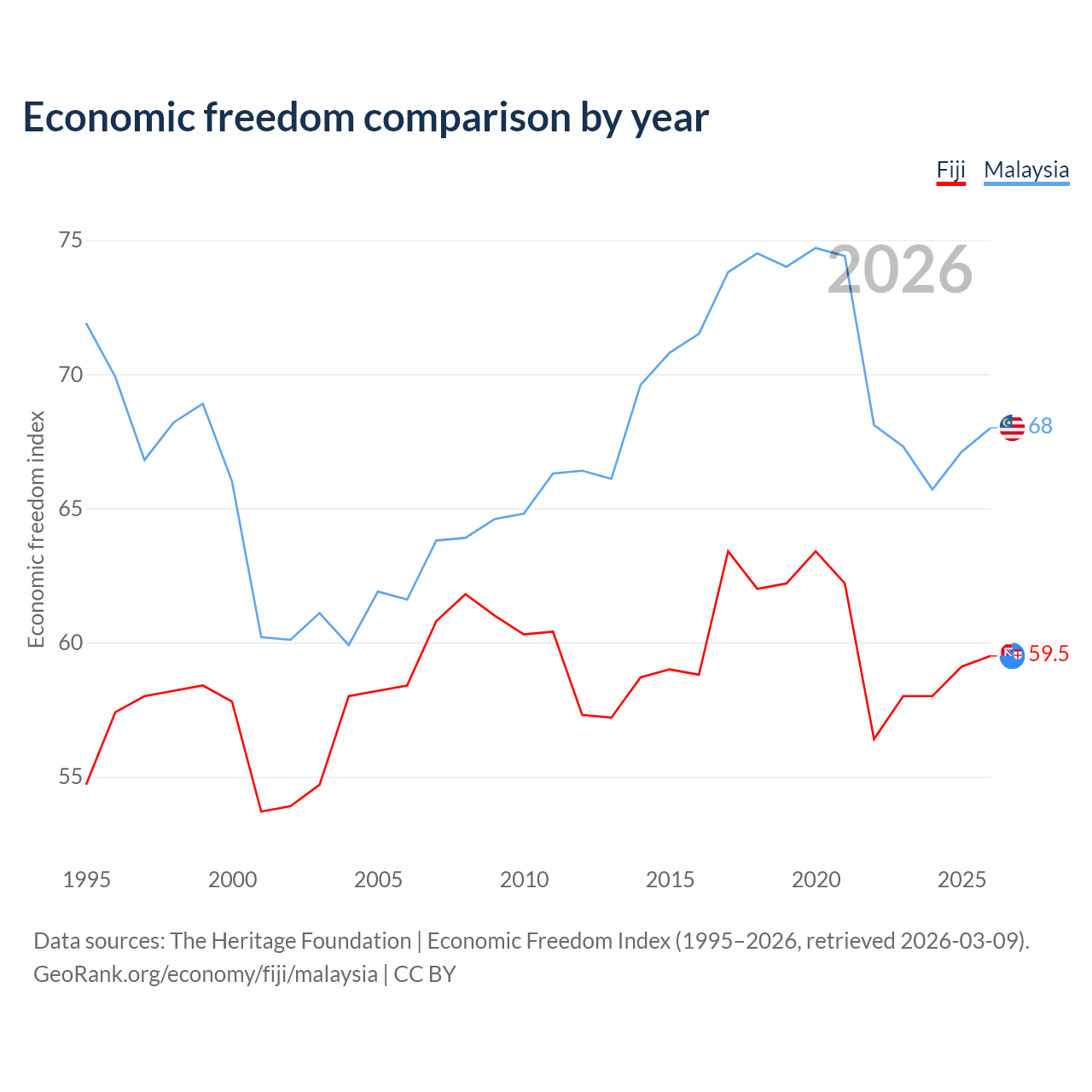 The Economic Freedom Index for Fiji is 59.5, ranking 103/197, compared to 68 for Malaysia, ranking 51/197. The chart above displays a comparison of annual changes in economic freedom indexes.