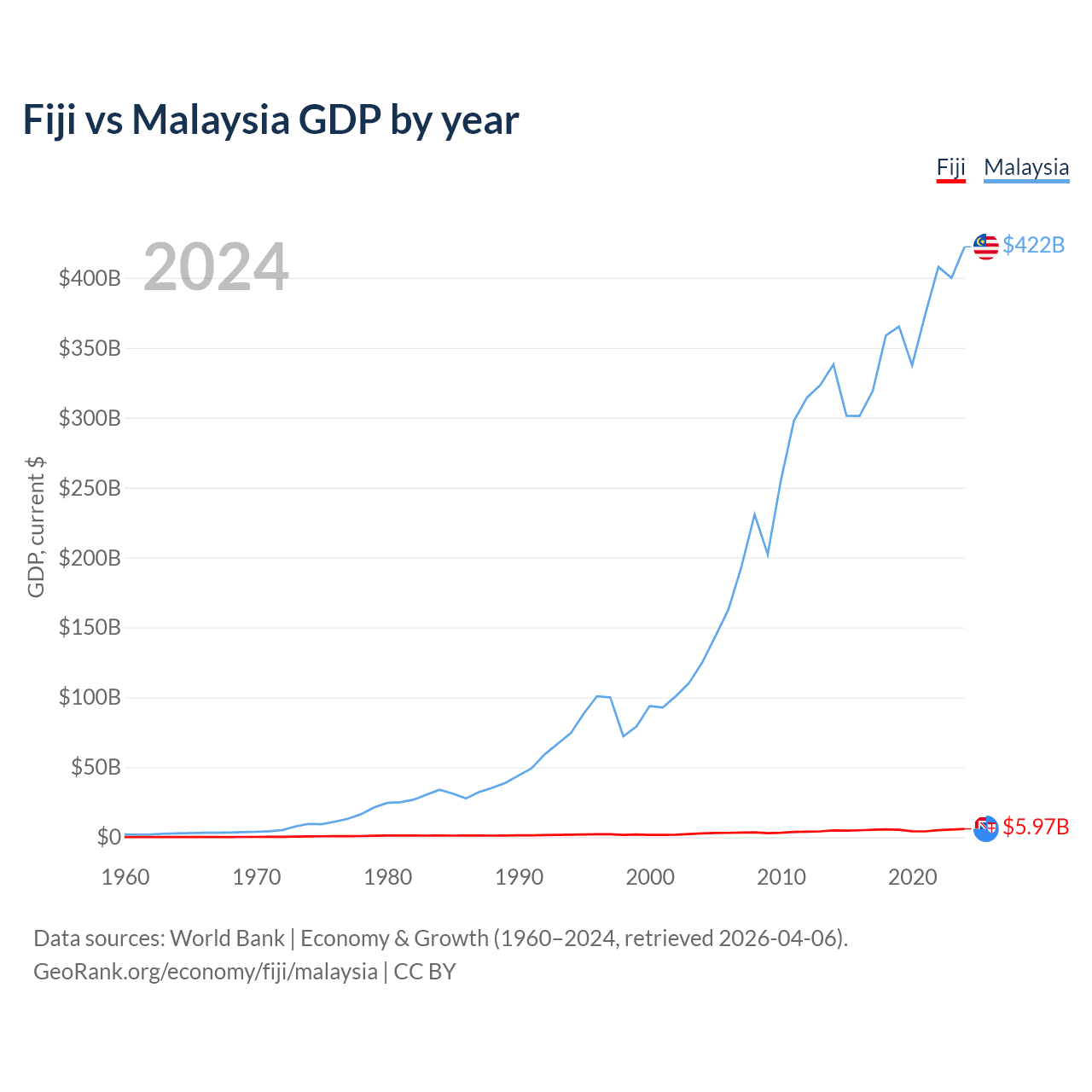 Fiji has a GDP of $5.97B compared to $422B for Malaysia, ranking 161/197 and 38/197 by economy size, respectively.