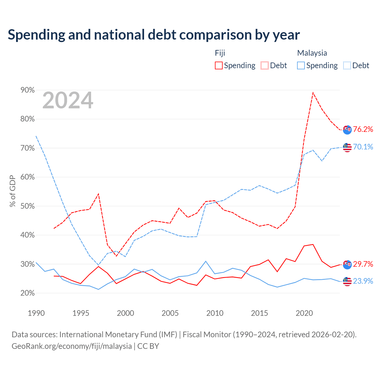 Fiji has $4.54B in government debt (76.2% of GDP), compared to $296B (70.1% of GDP) in Malaysia.
