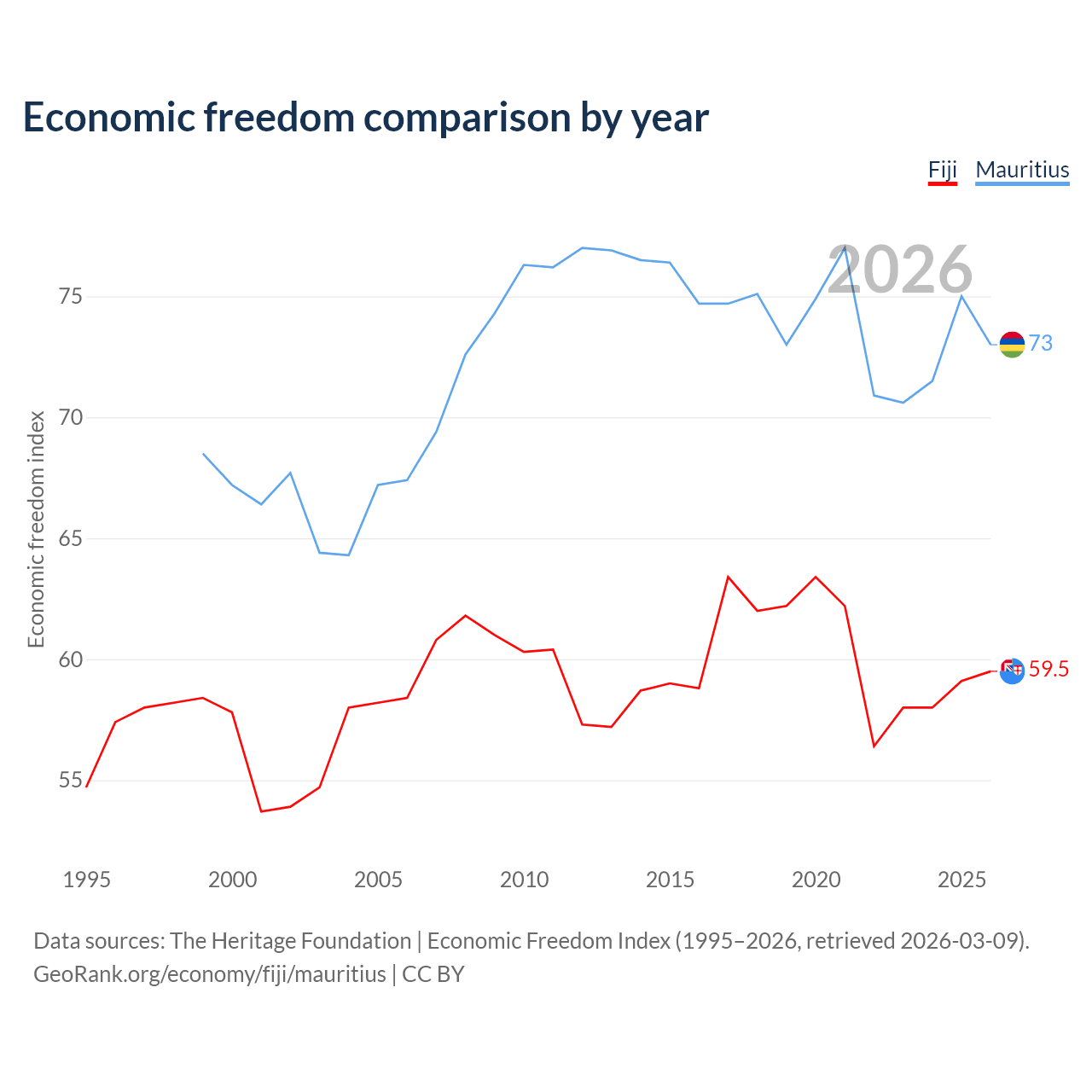 The Economic Freedom Index for Fiji is 59.5, ranking 103/197, compared to 73 for Mauritius, ranking 26/197. The chart above displays a comparison of annual changes in economic freedom indexes.