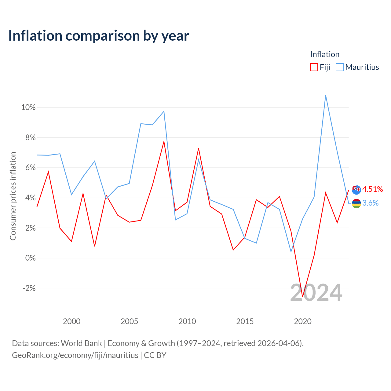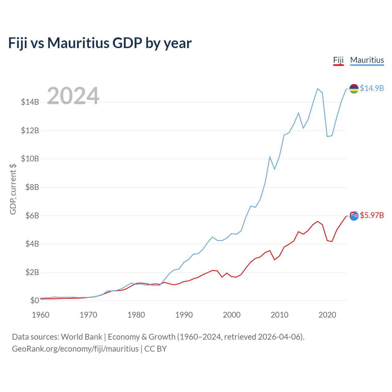 Fiji has a GDP of $5.97B compared to $14.9B for Mauritius, ranking 161/197 and 143/197 by economy size, respectively.