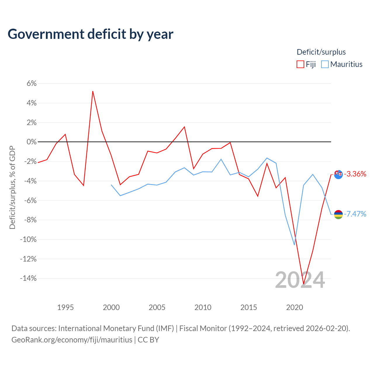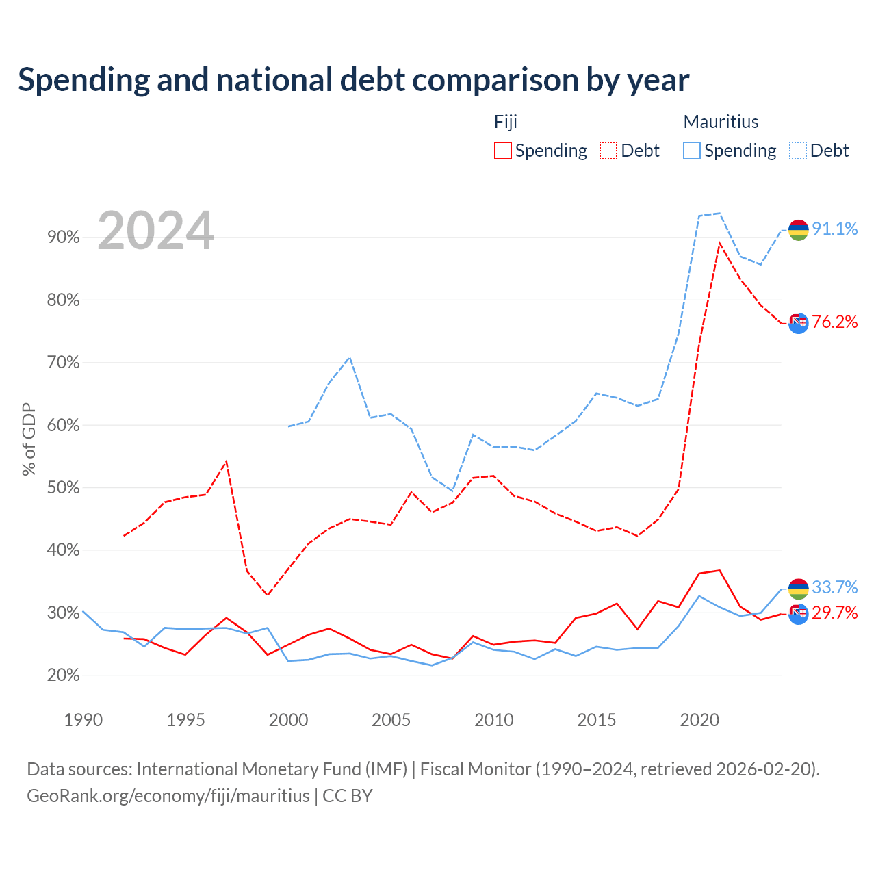 Fiji has $4.54B in government debt (76.2% of GDP), compared to $13.6B (91.1% of GDP) in Mauritius.