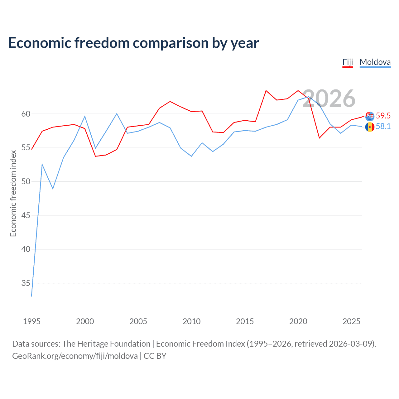The Economic Freedom Index for Fiji is 59.5, ranking 103/197, compared to 58.1 for Moldova, ranking 112/197. The chart above displays a comparison of annual changes in economic freedom indexes.