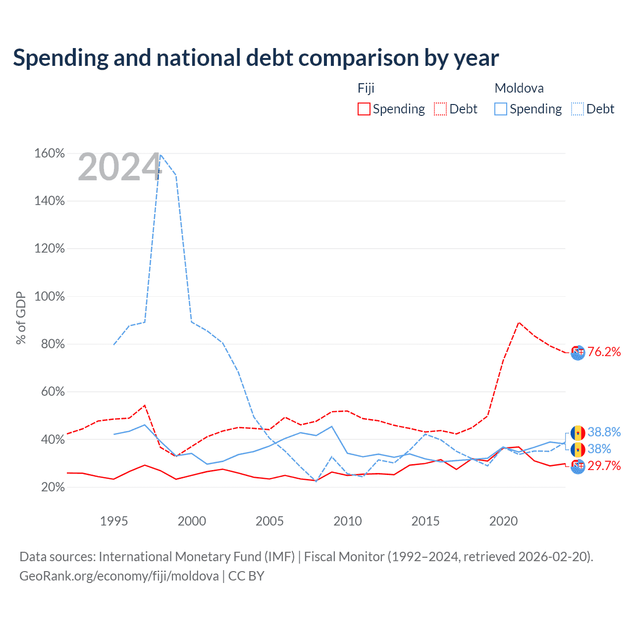 Fiji has $4.54B in government debt (76.2% of GDP), compared to $7.06B (38.8% of GDP) in Moldova.