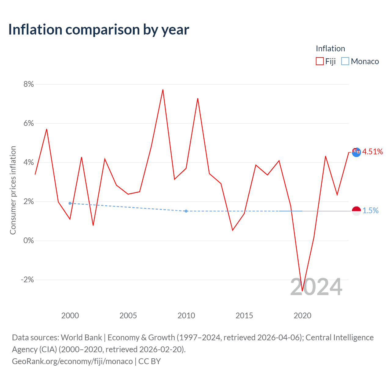 Over the past 21 years, Fiji has recorded an average annual inflation rate of 3.02%, compared with 1.58% in Monaco. In 2020, inflation was 4.51% in Fiji and 1.5% in Monaco.