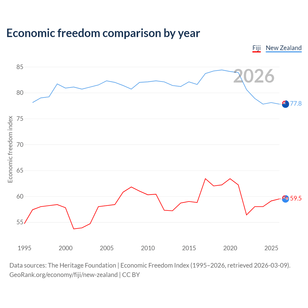The Economic Freedom Index for Fiji is 59.5, ranking 103/197, compared to 77.8 for New Zealand, ranking 13/197. The chart above displays a comparison of annual changes in economic freedom indexes.
