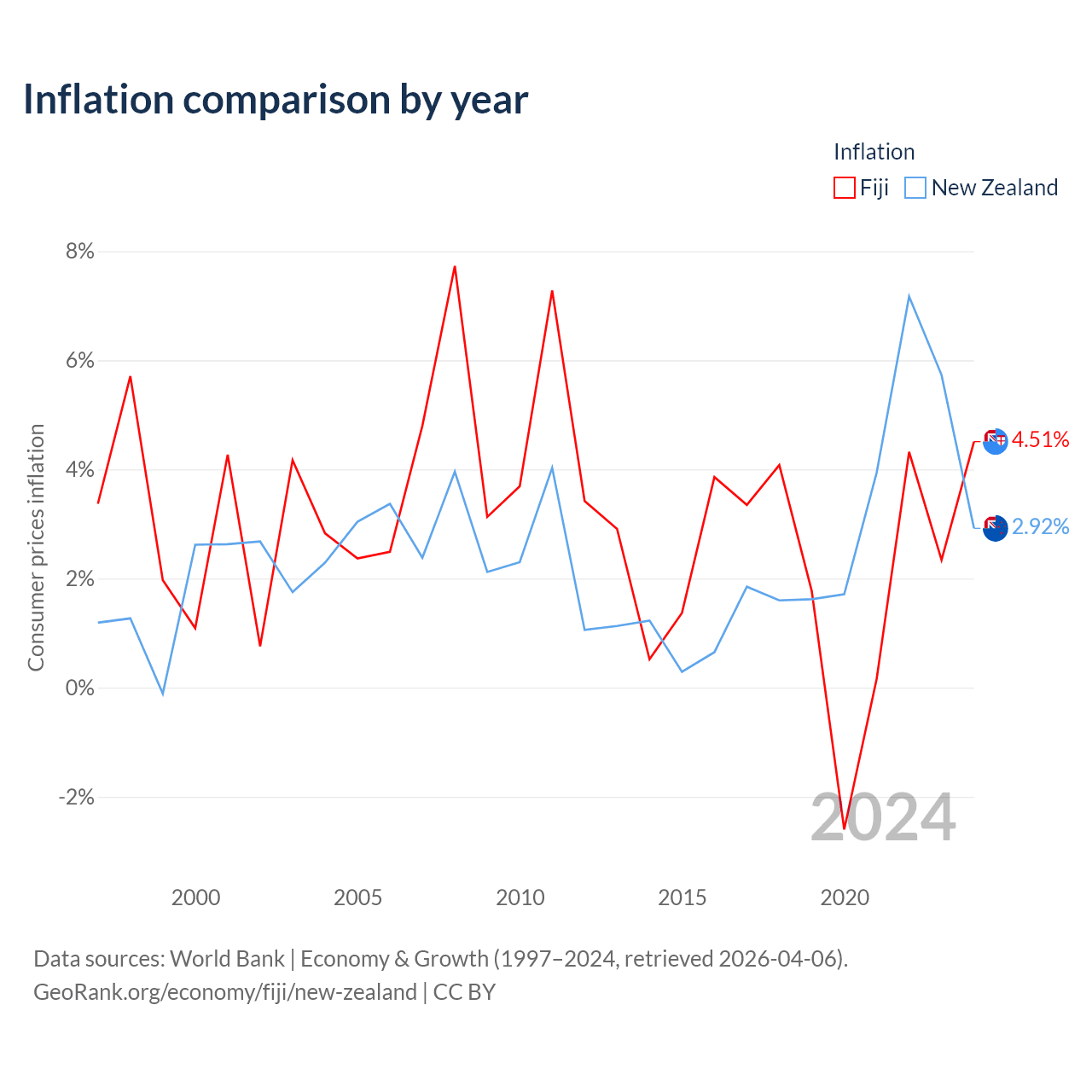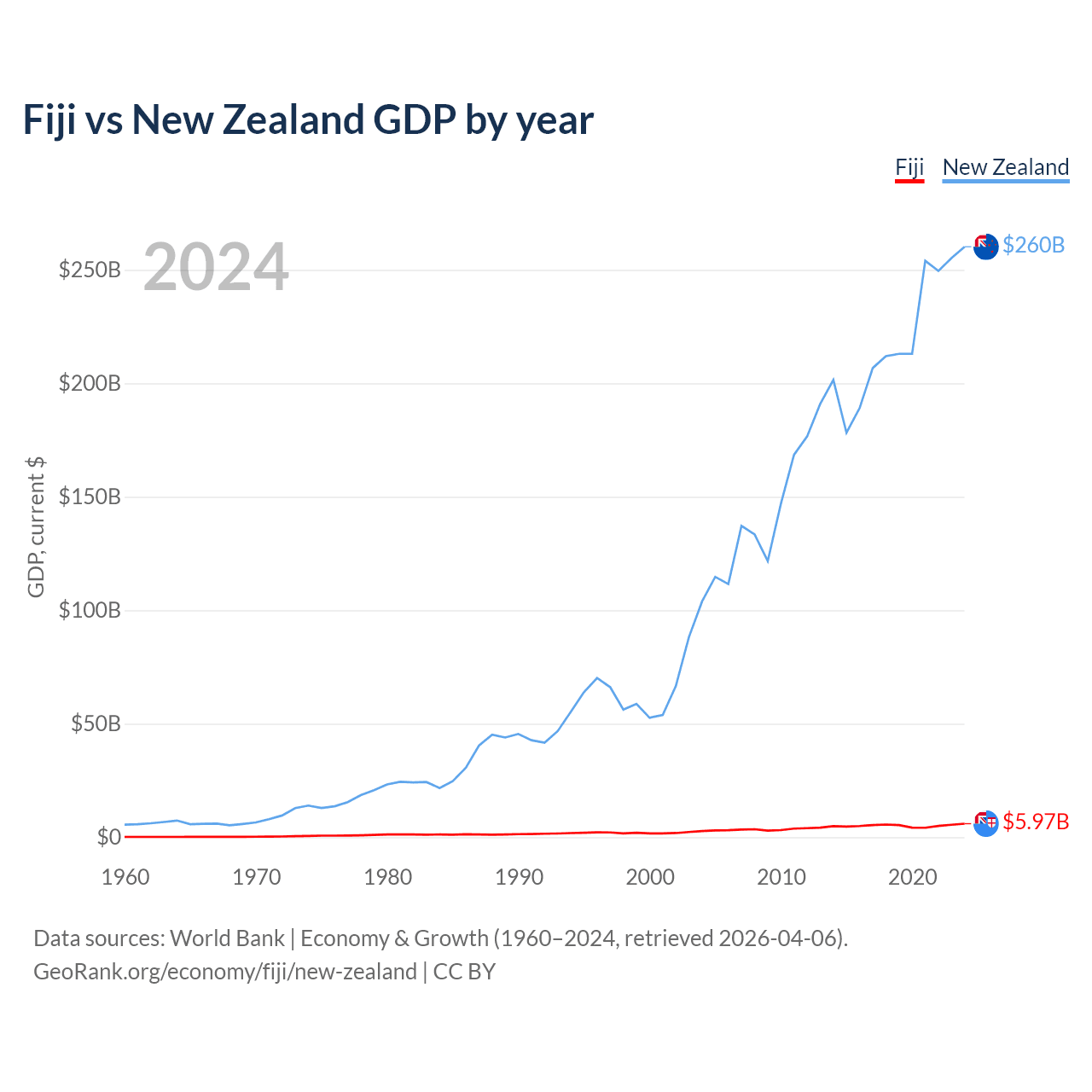 Fiji has a GDP of $5.97B compared to $260B for New Zealand, ranking 161/197 and 52/197 by economy size, respectively.