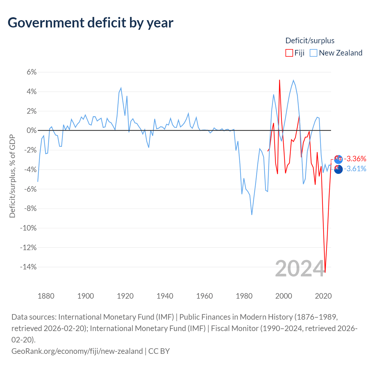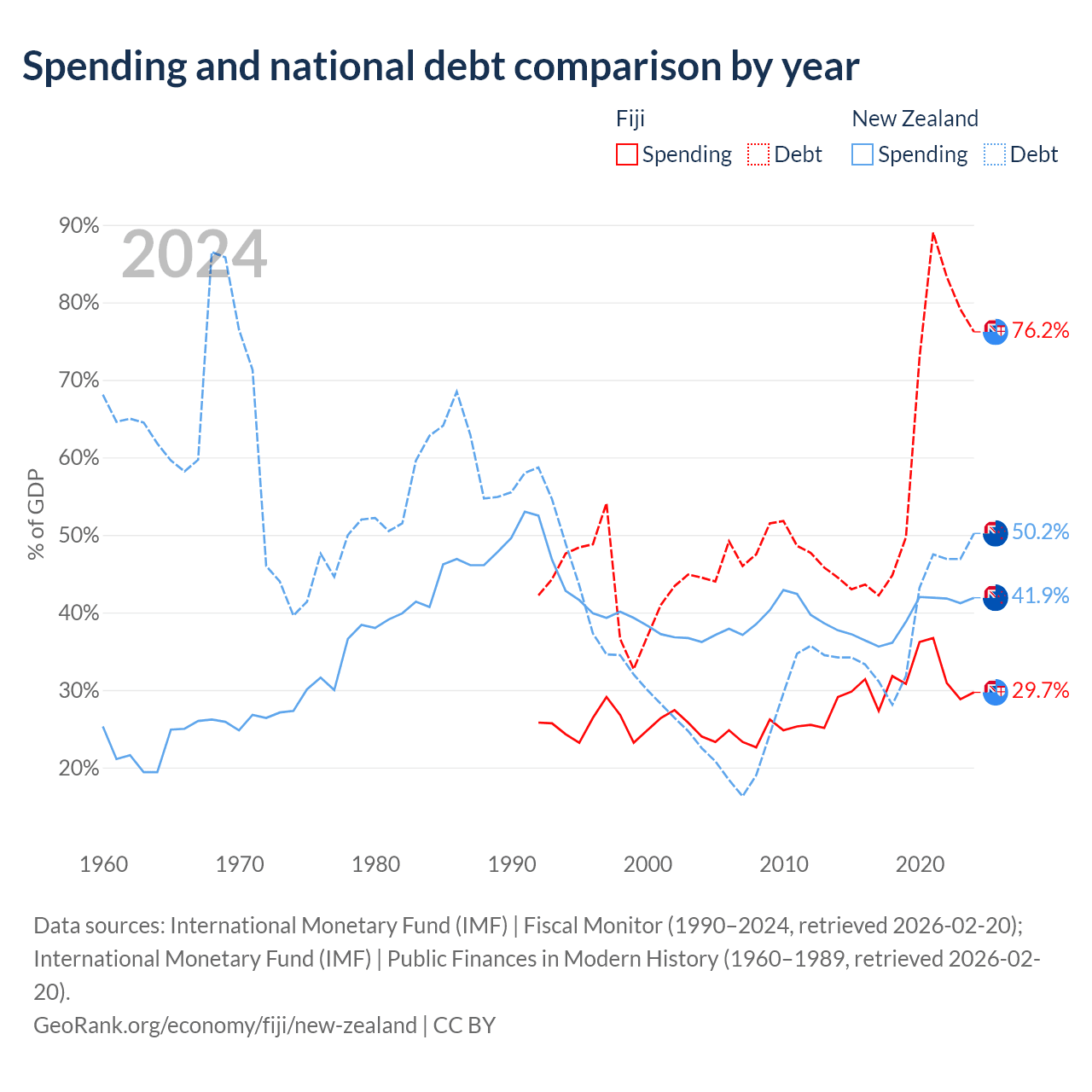 Fiji has $4.54B in government debt (76.2% of GDP), compared to $131B (50.2% of GDP) in New Zealand.