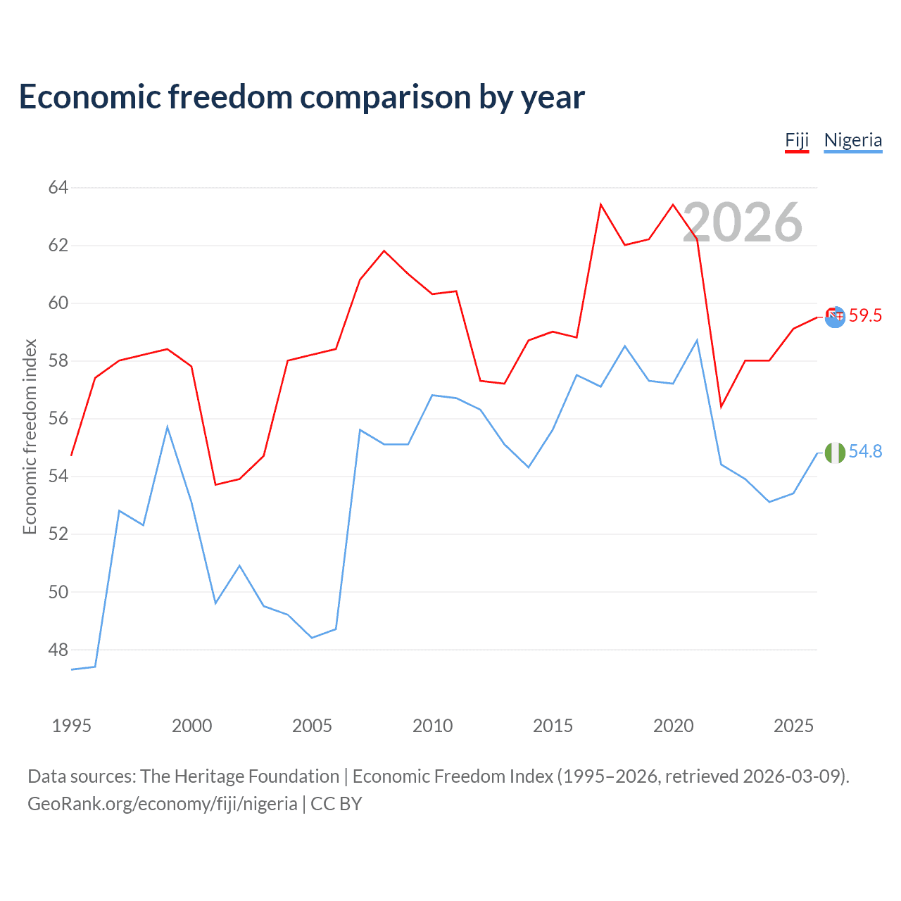 The Economic Freedom Index for Fiji is 59.1, ranking 103/197, compared to 53.4 for Nigeria, ranking 141/197. The chart below displays a comparison of annual changes in economic freedom indexes.