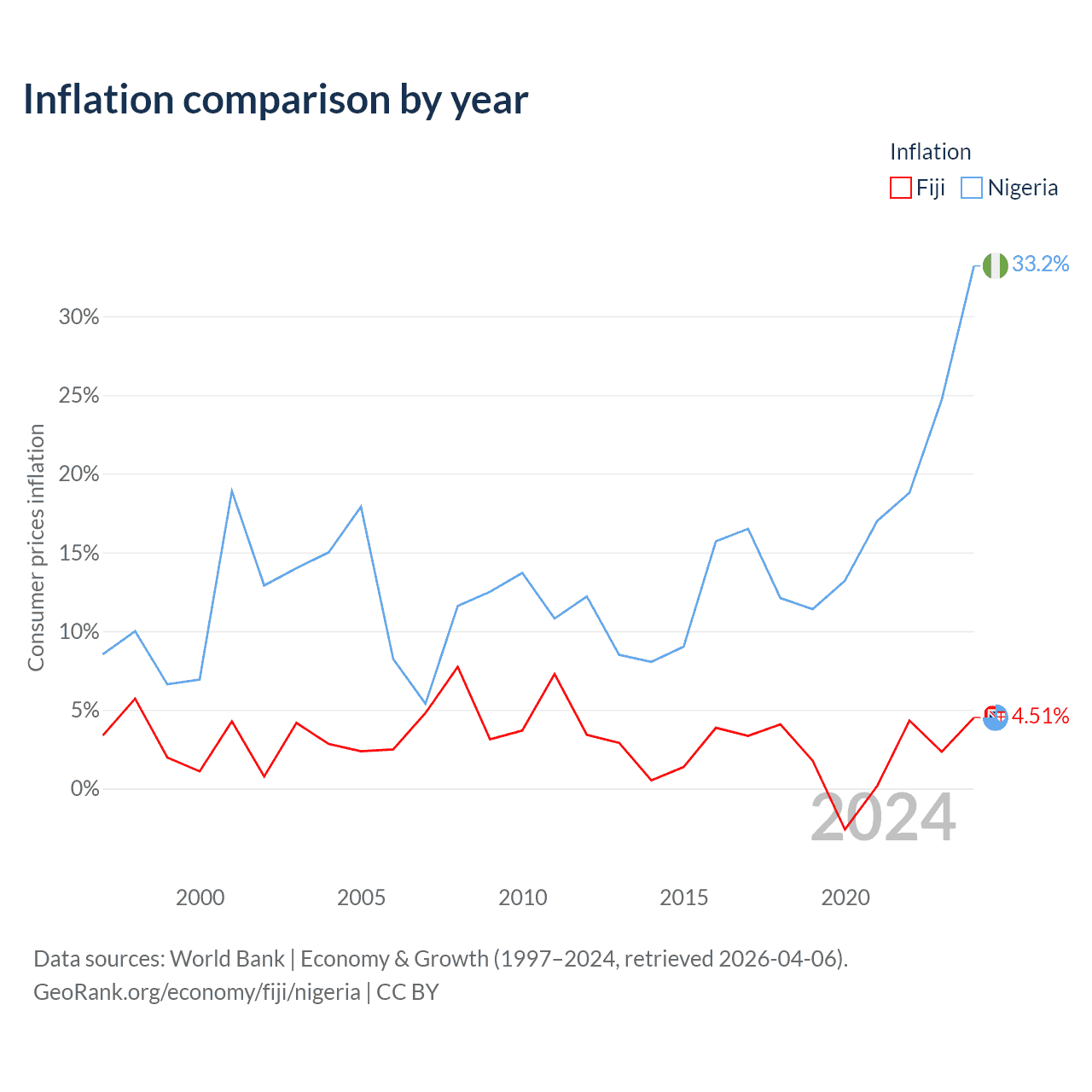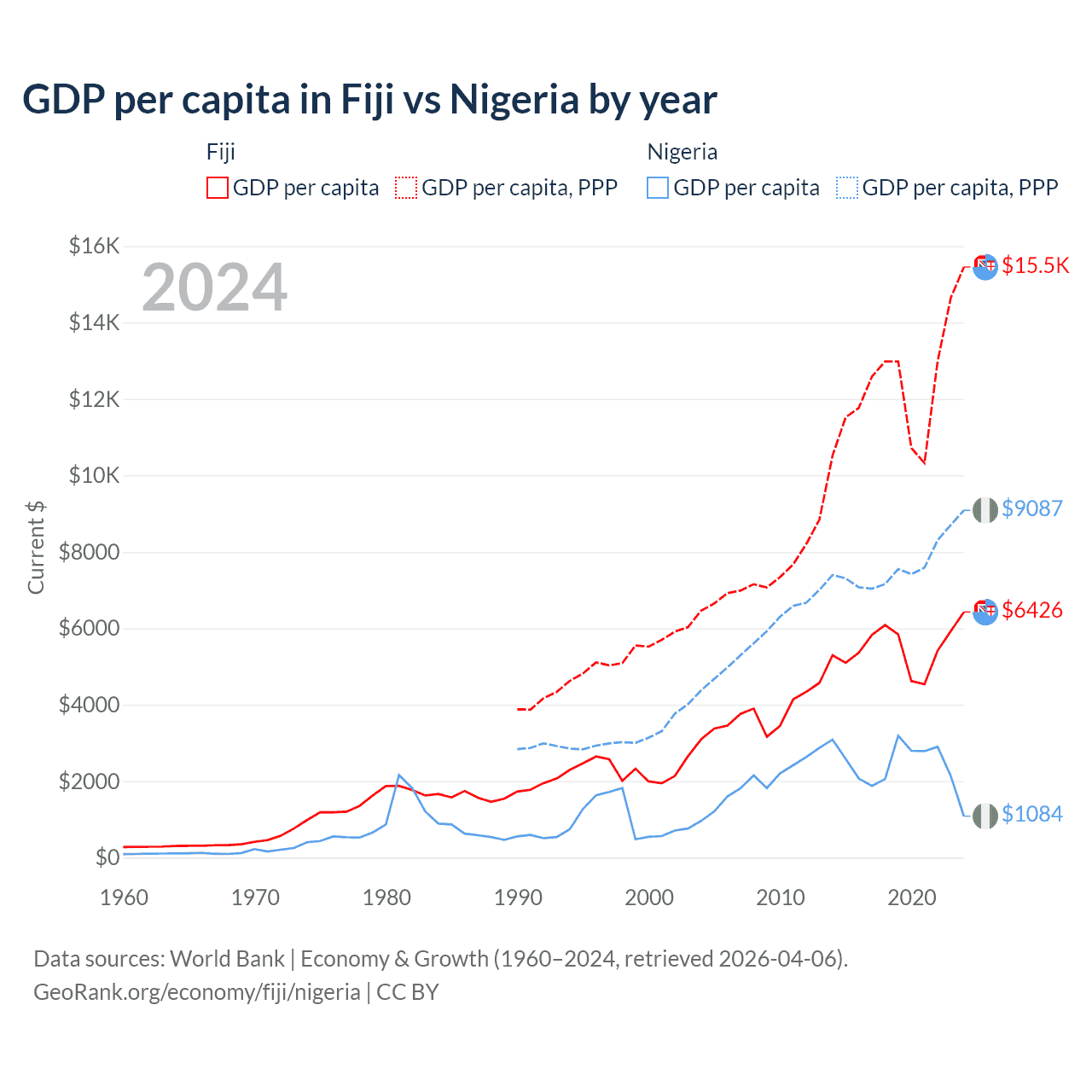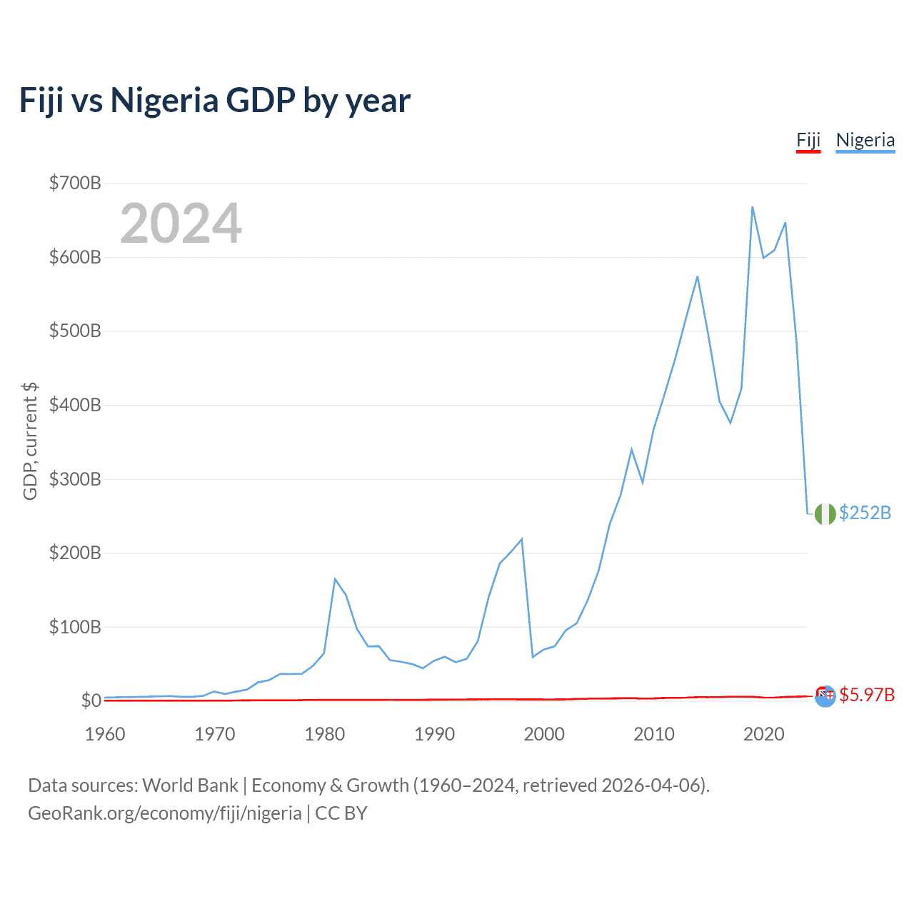 Fiji has a GDP of $5.97B compared to $252B for Nigeria, ranking 161/197 and 54/197 by economy size, respectively.