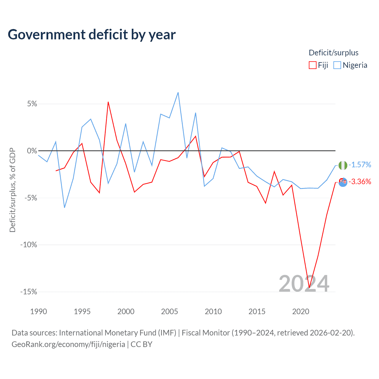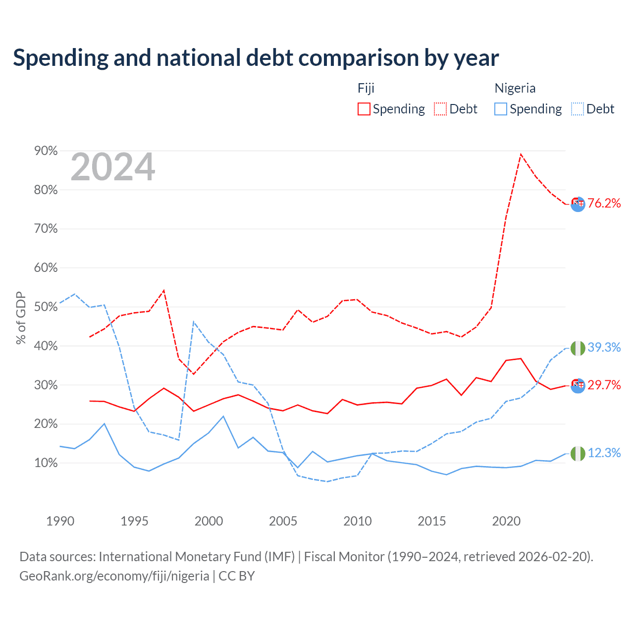 Fiji has $4.59B in government debt (76.4% of GDP), compared to $133B (51.6% of GDP) in Nigeria.