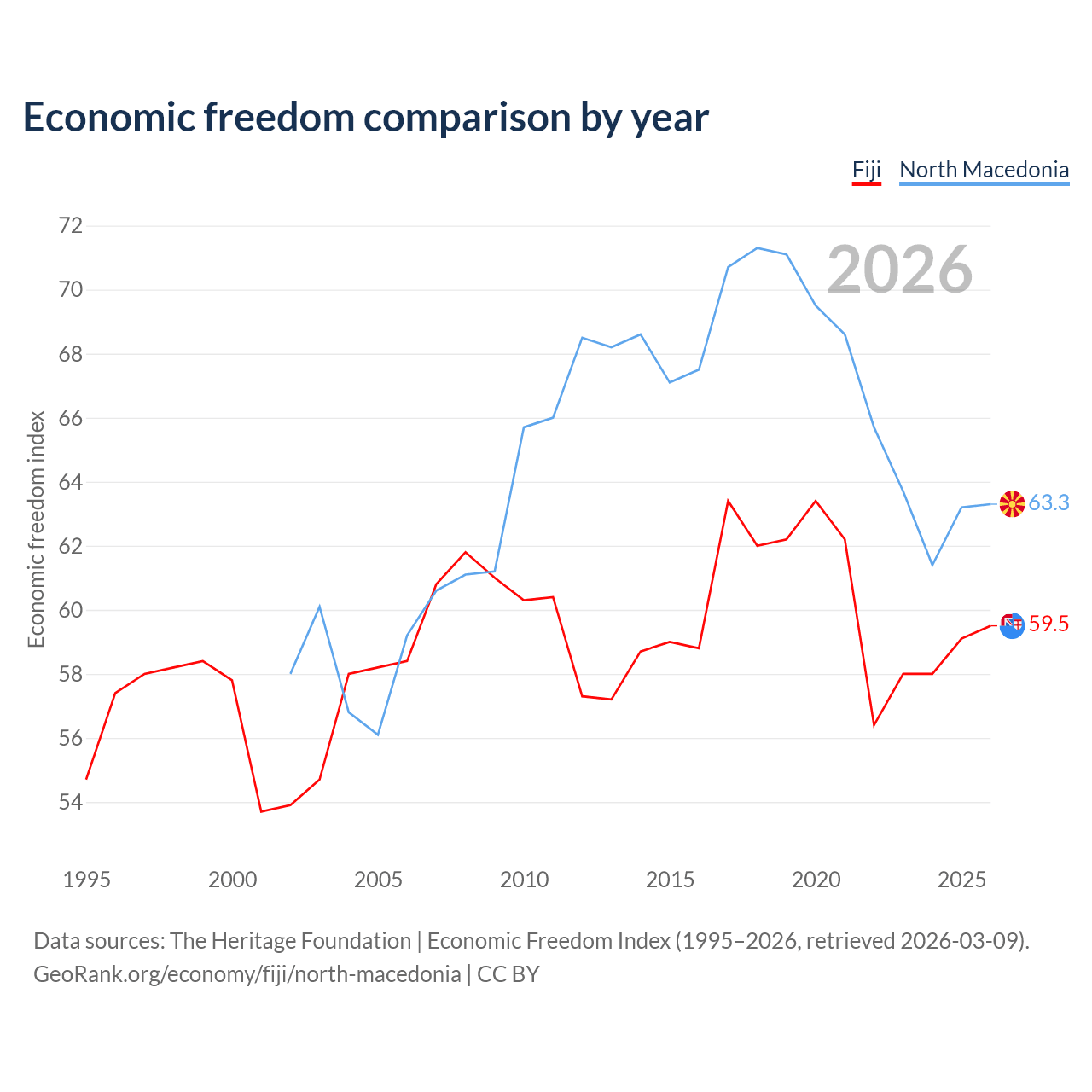 The Economic Freedom Index for Fiji is 59.5, ranking 103/197, compared to 63.3 for North Macedonia, ranking 81/197. The chart above displays a comparison of annual changes in economic freedom indexes.