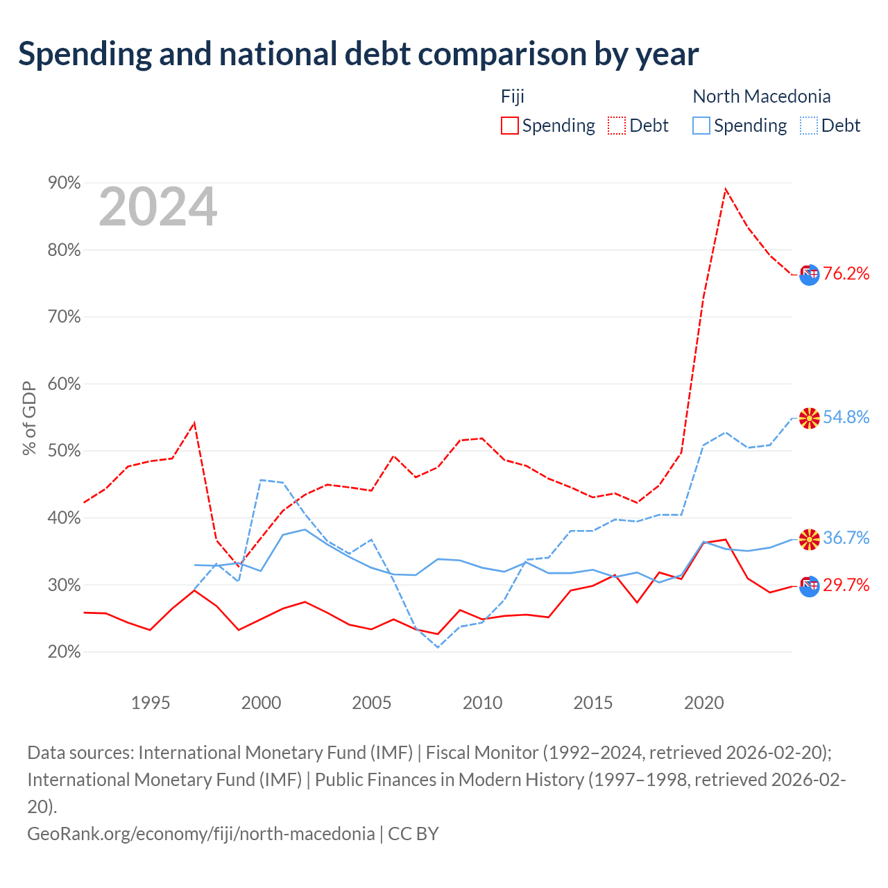 Fiji has $4.54B in government debt (76.2% of GDP), compared to $9.3B (54.8% of GDP) in North Macedonia.