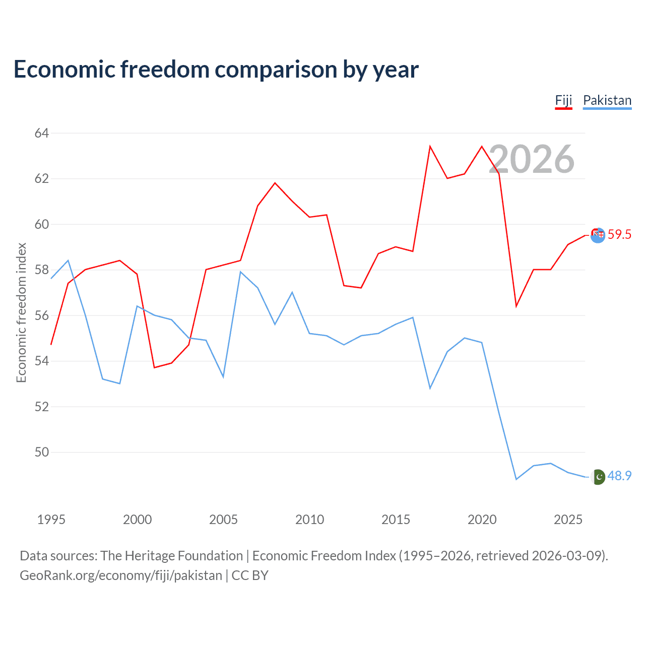 The Economic Freedom Index for Fiji is 59.5, ranking 103/197, compared to 48.9 for Pakistan, ranking 168/197. The chart above displays a comparison of annual changes in economic freedom indexes.