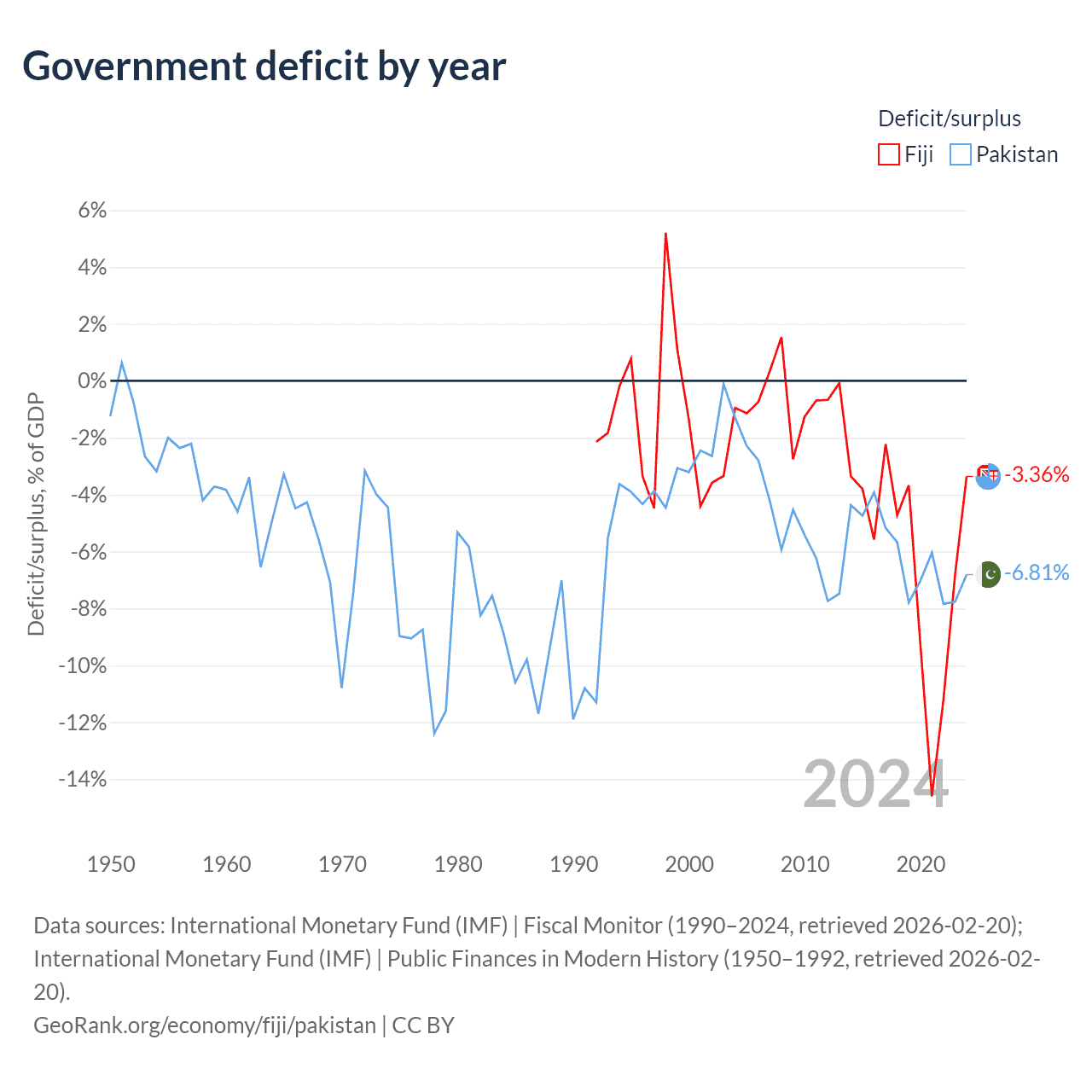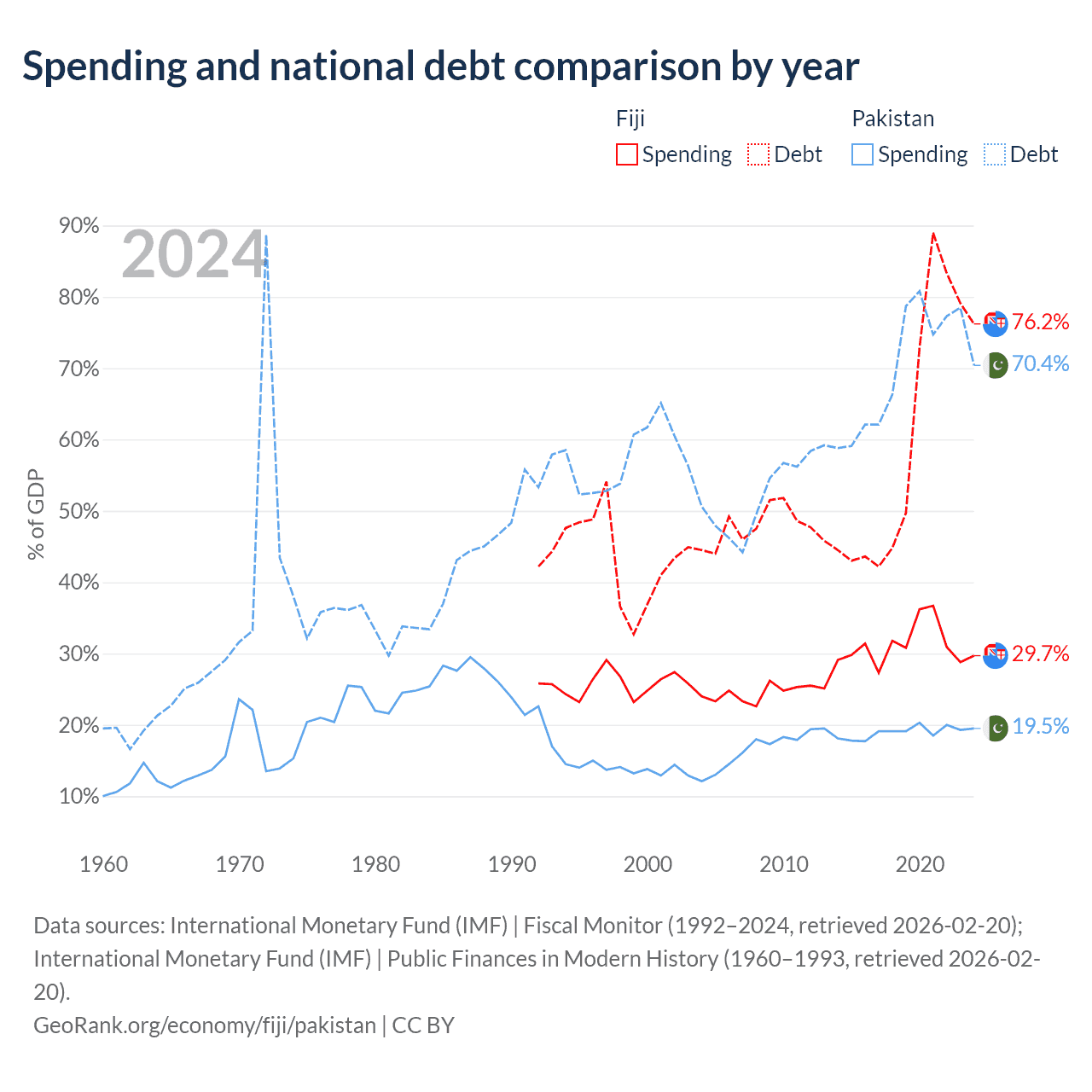 Fiji has $4.54B in government debt (76.2% of GDP), compared to $262B (70.4% of GDP) in Pakistan.