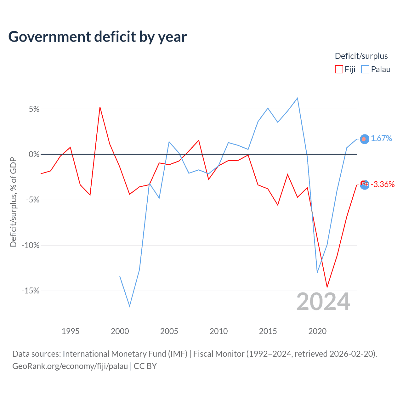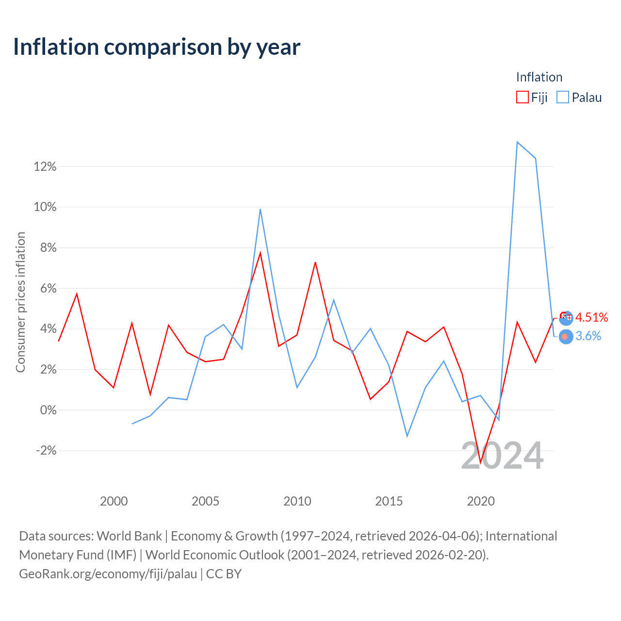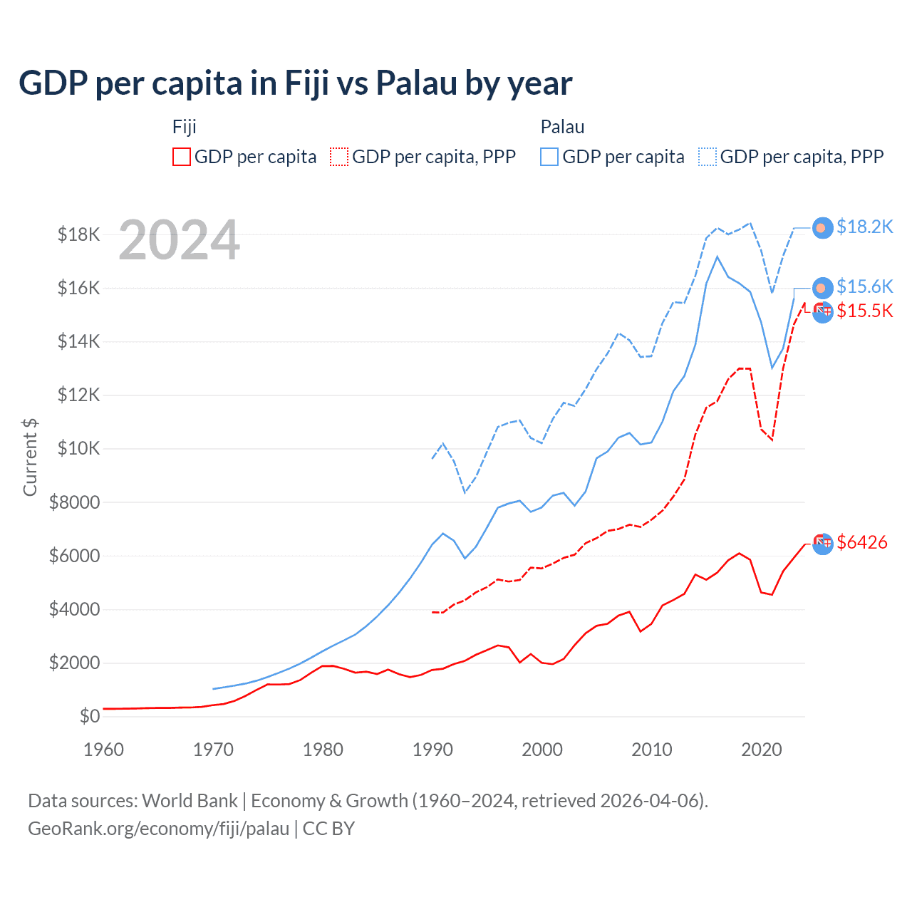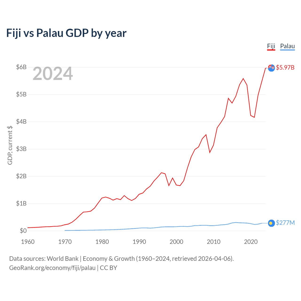 Fiji has a GDP of $5.97B compared to $277M for Palau, ranking 161/197 and 194/197 by economy size, respectively.