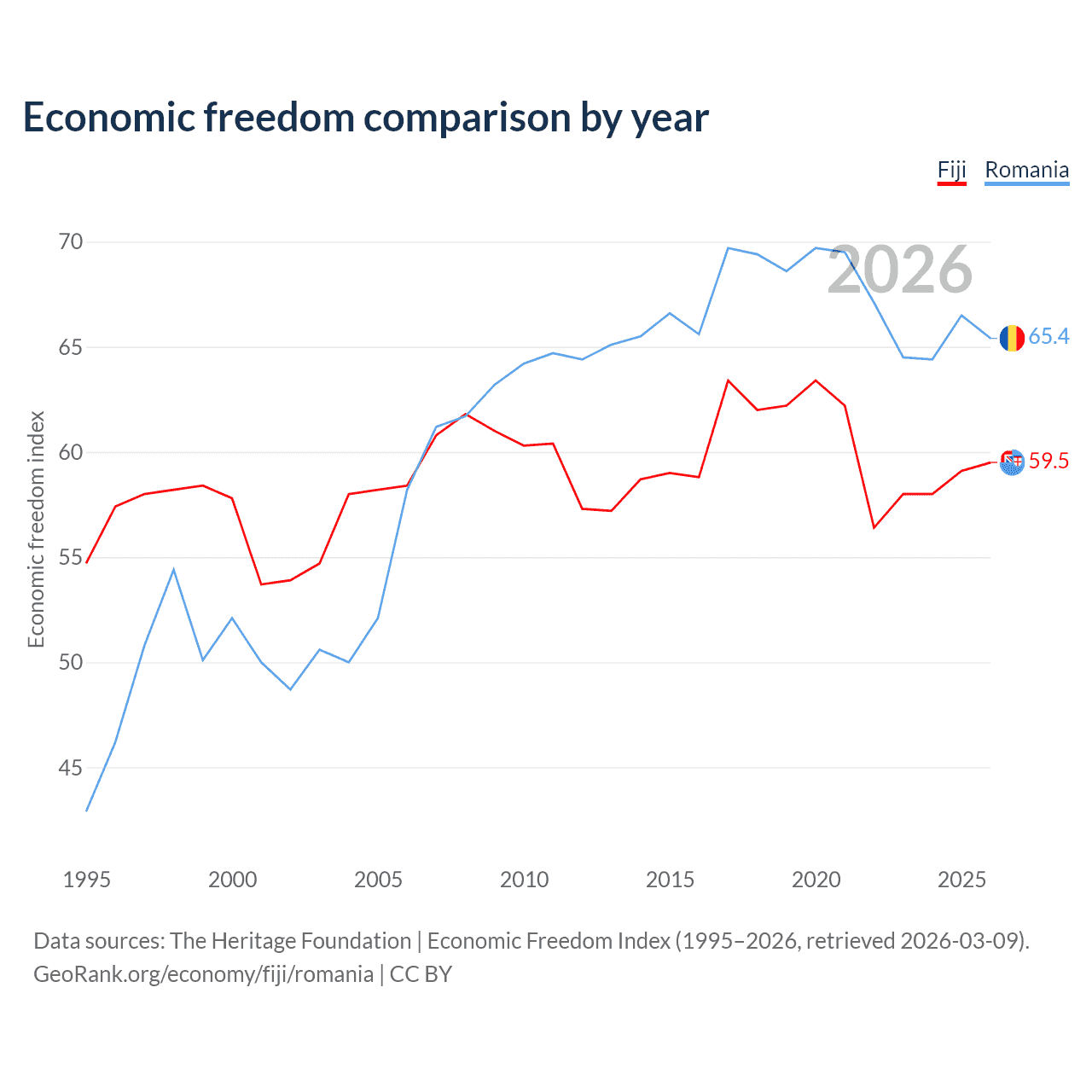 The Economic Freedom Index for Fiji is 59.5, ranking 103/197, compared to 65.4 for Romania, ranking 64/197. The chart above displays a comparison of annual changes in economic freedom indexes.