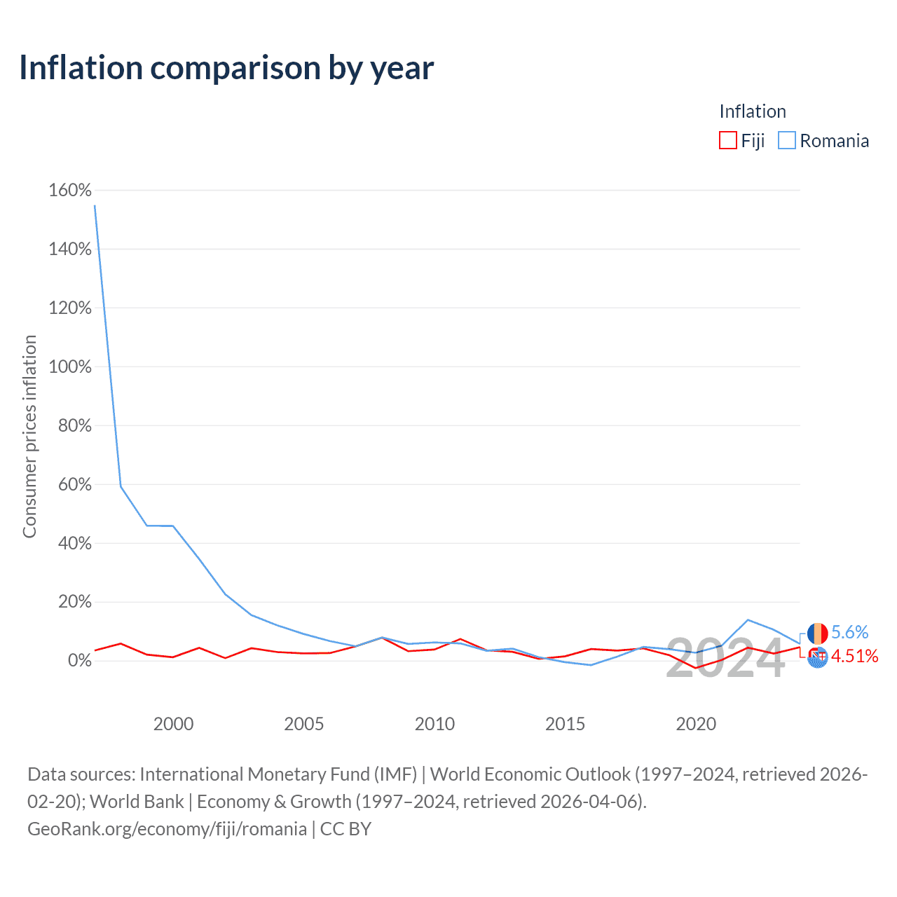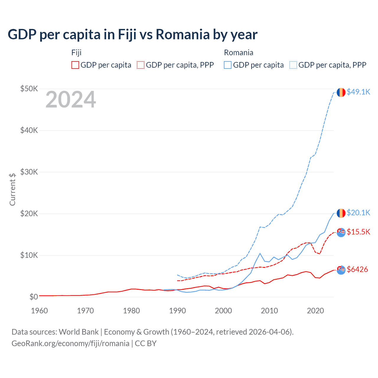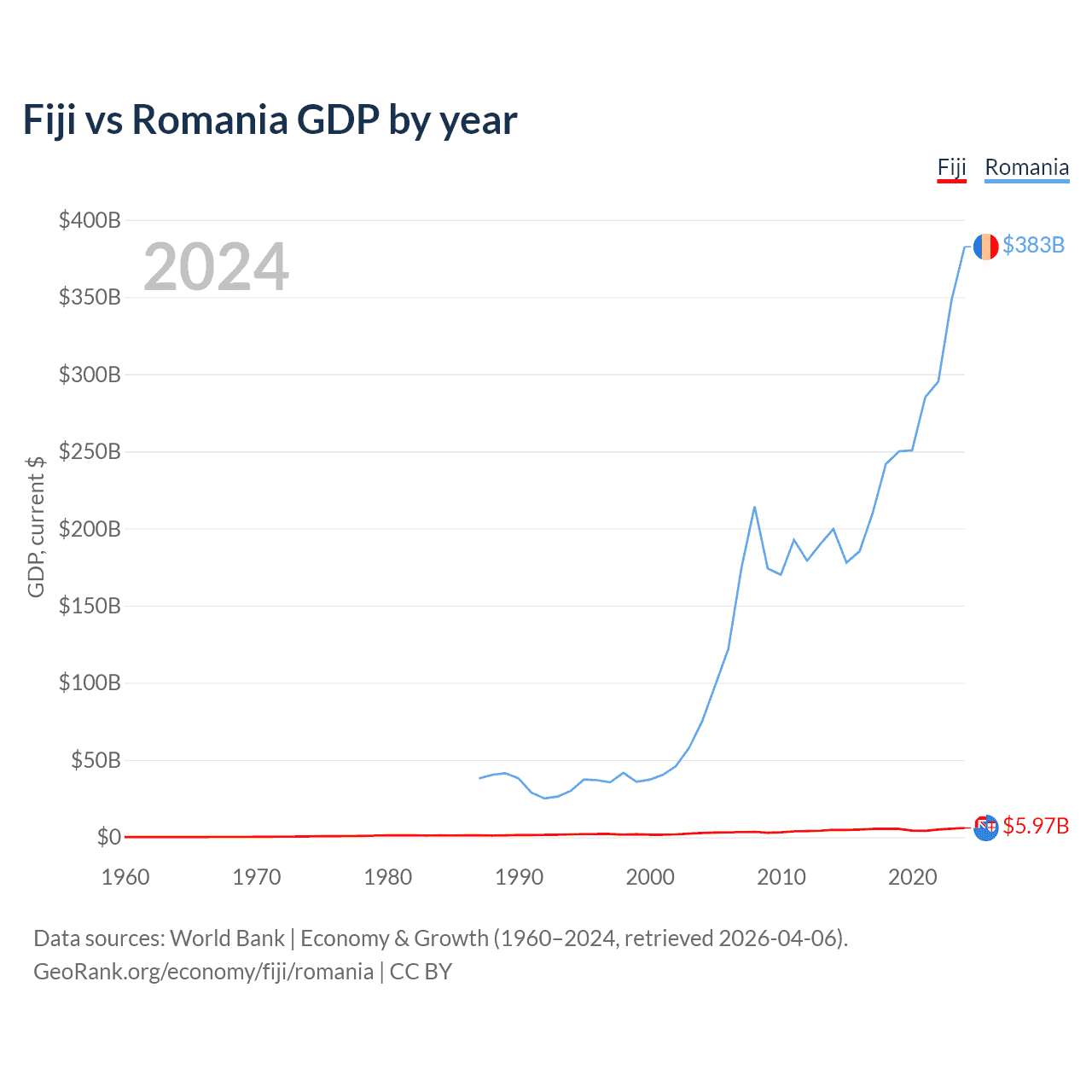 Fiji has a GDP of $5.97B compared to $383B for Romania, ranking 161/197 and 42/197 by economy size, respectively.