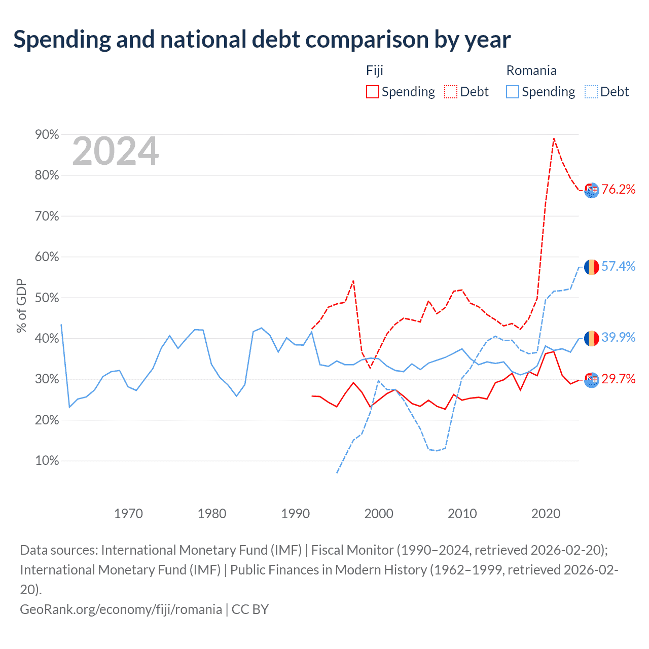 Fiji has $4.54B in government debt (76.2% of GDP), compared to $220B (57.4% of GDP) in Romania.