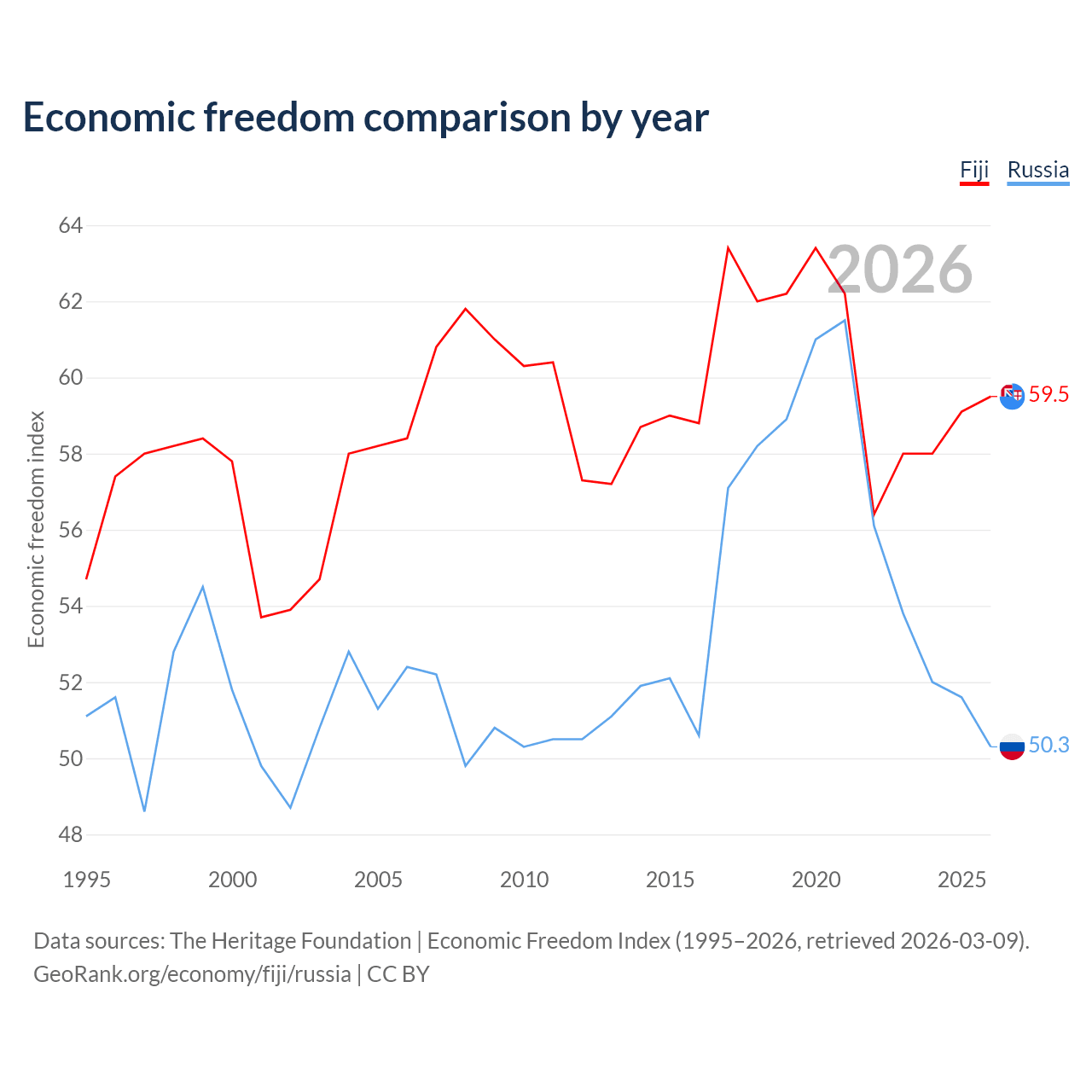 The Economic Freedom Index for Fiji is 59.5, ranking 103/197, compared to 50.3 for Russia, ranking 161/197. The chart above displays a comparison of annual changes in economic freedom indexes.