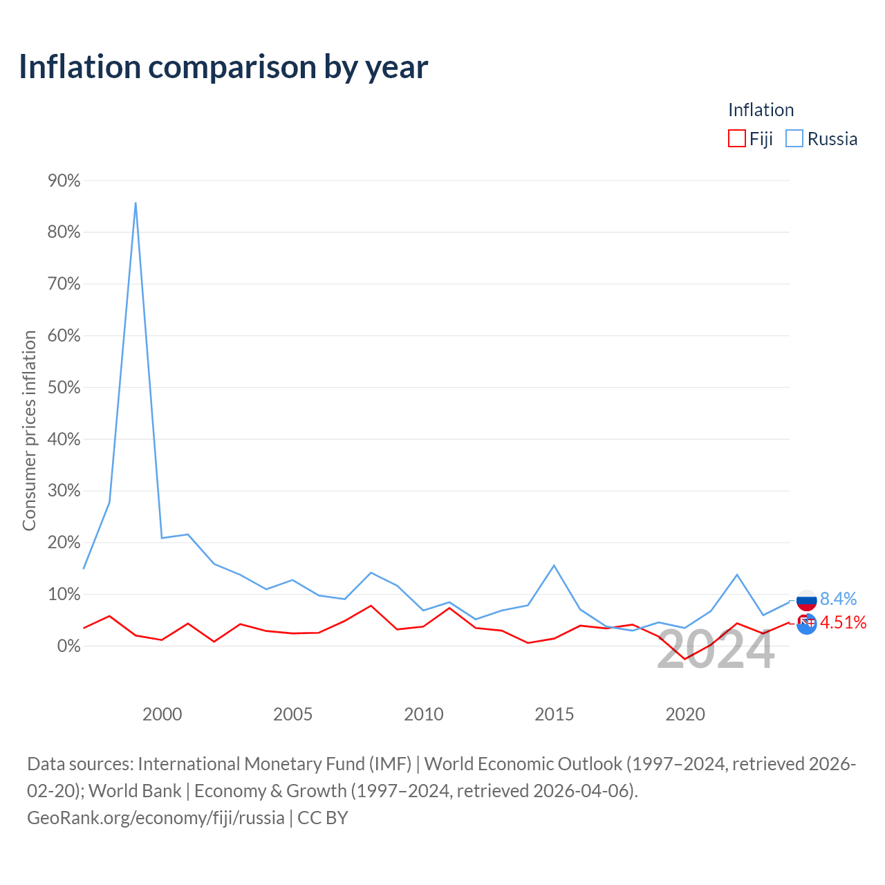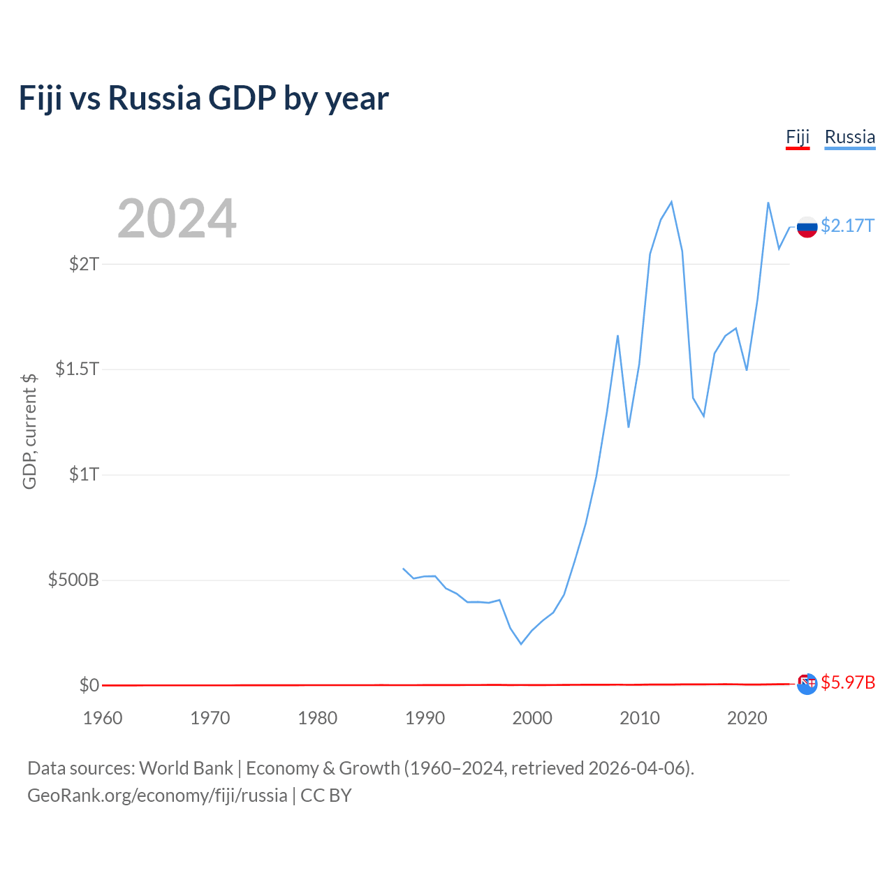 Fiji has a GDP of $5.97B compared to $2.17T for Russia, ranking 161/197 and 11/197 by economy size, respectively.