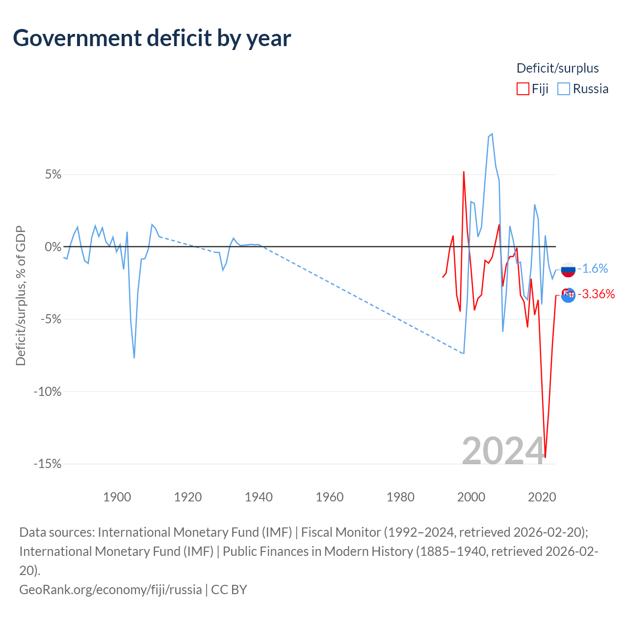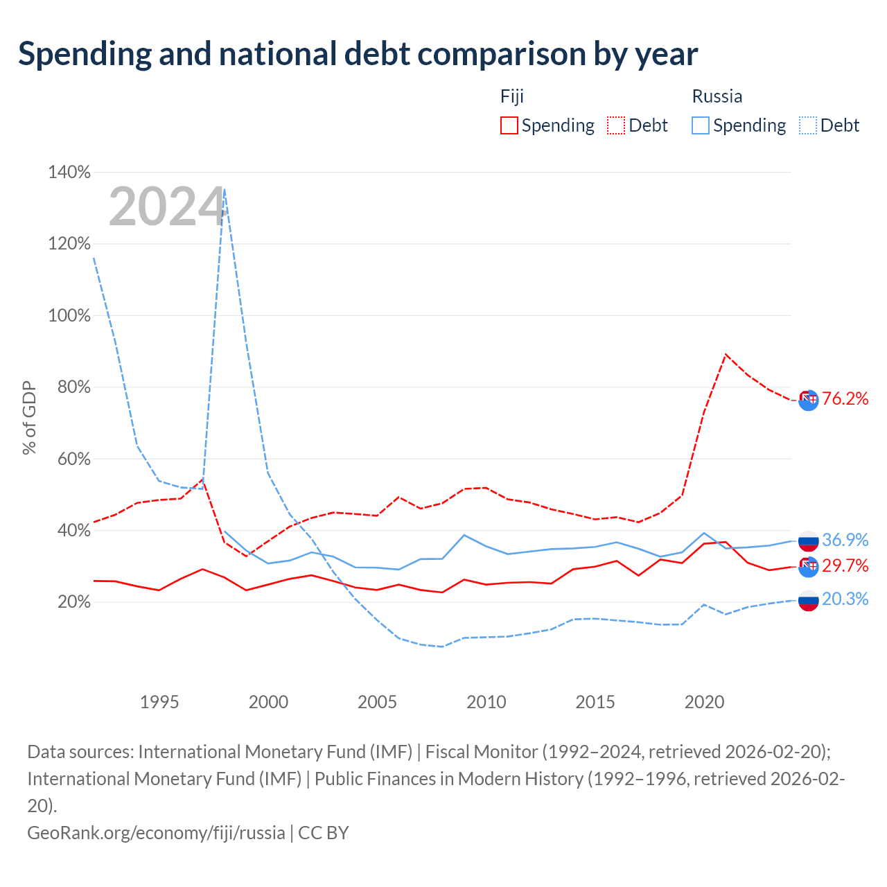 Fiji has $4.54B in government debt (76.2% of GDP), compared to $440B (20.3% of GDP) in Russia.