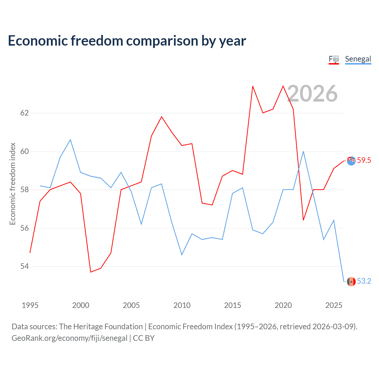 The Economic Freedom Index for Fiji is 59.5, ranking 103/197, compared to 53.2 for Senegal, ranking 140/197. The chart above displays a comparison of annual changes in economic freedom indexes.