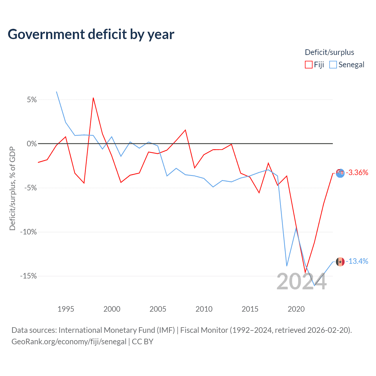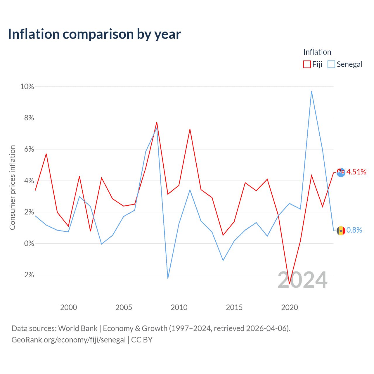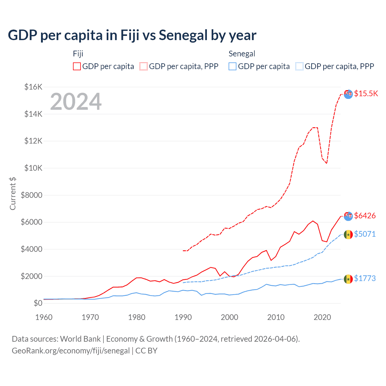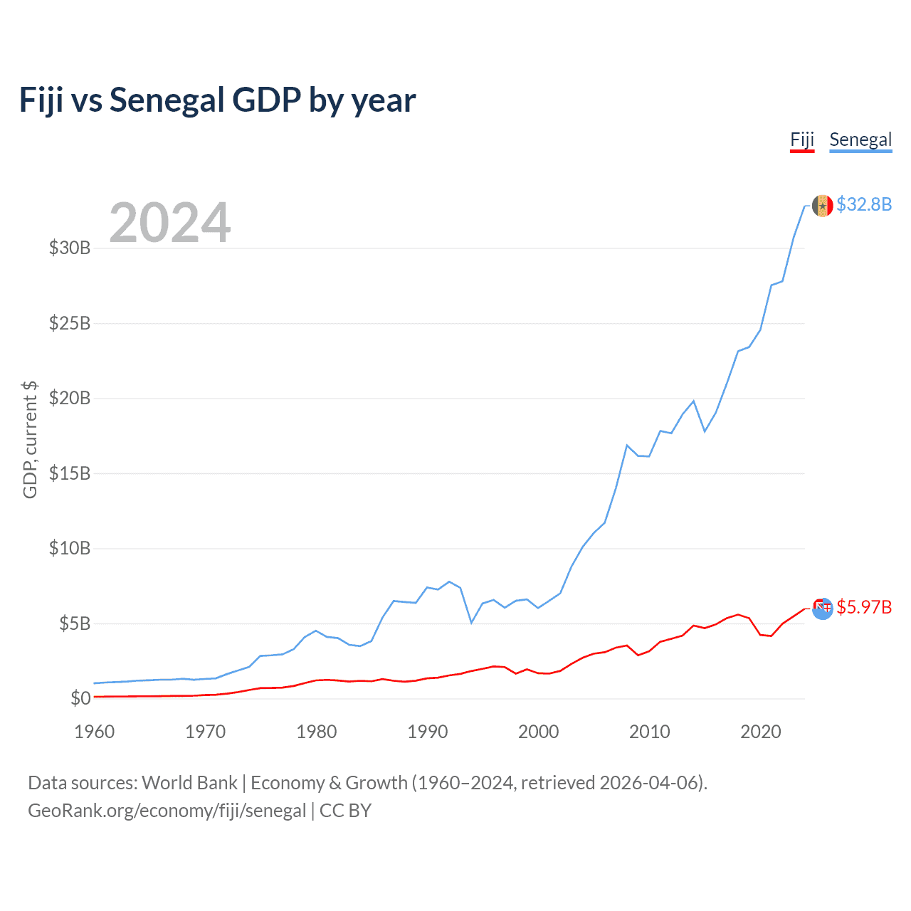 Fiji has a GDP of $5.97B compared to $32.8B for Senegal, ranking 161/197 and 109/197 by economy size, respectively.