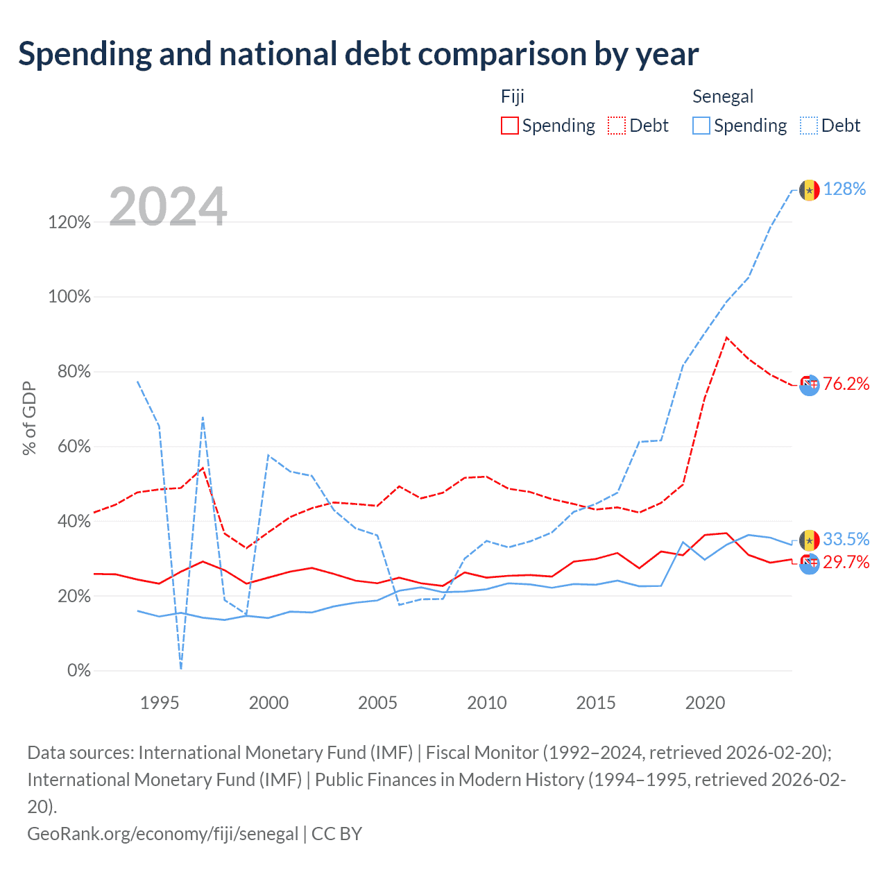 Fiji has $4.54B in government debt (76.2% of GDP), compared to $42.1B (128.4% of GDP) in Senegal.