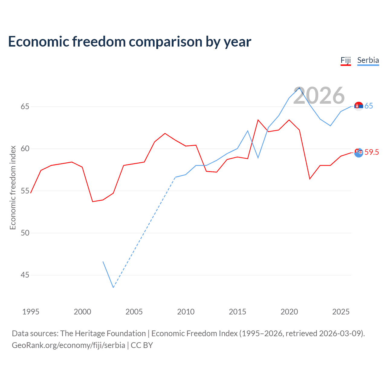 The Economic Freedom Index for Fiji is 59.5, ranking 103/197, compared to 65 for Serbia, ranking 68/197. The chart above displays a comparison of annual changes in economic freedom indexes.