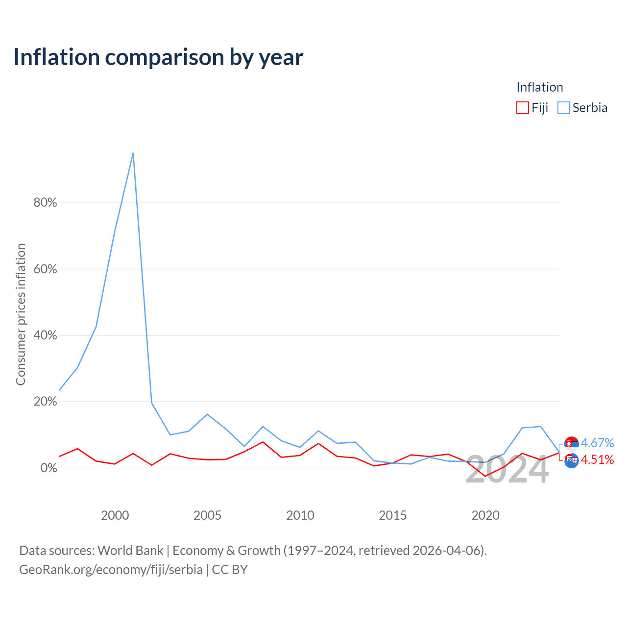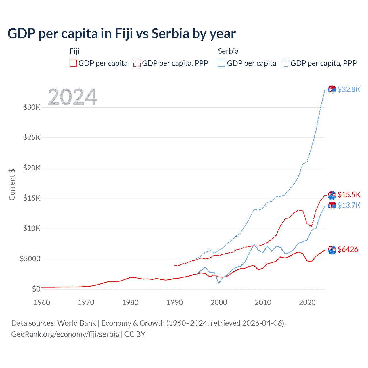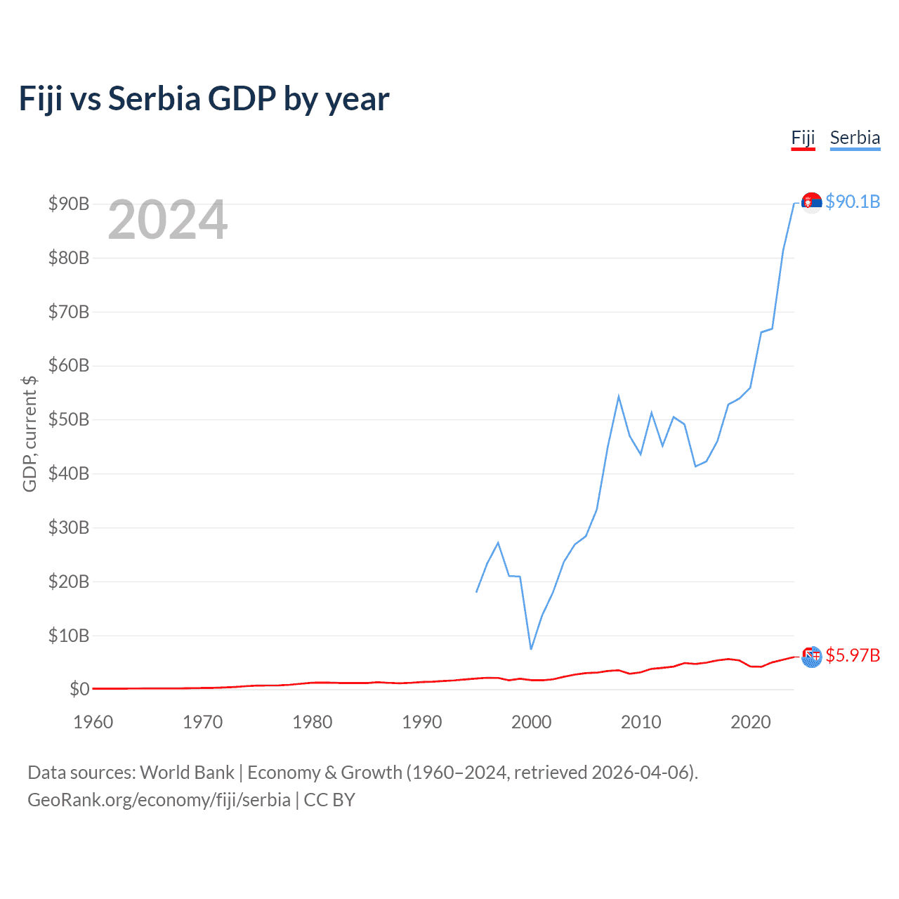 Fiji has a GDP of $5.97B compared to $90.1B for Serbia, ranking 161/197 and 76/197 by economy size, respectively.