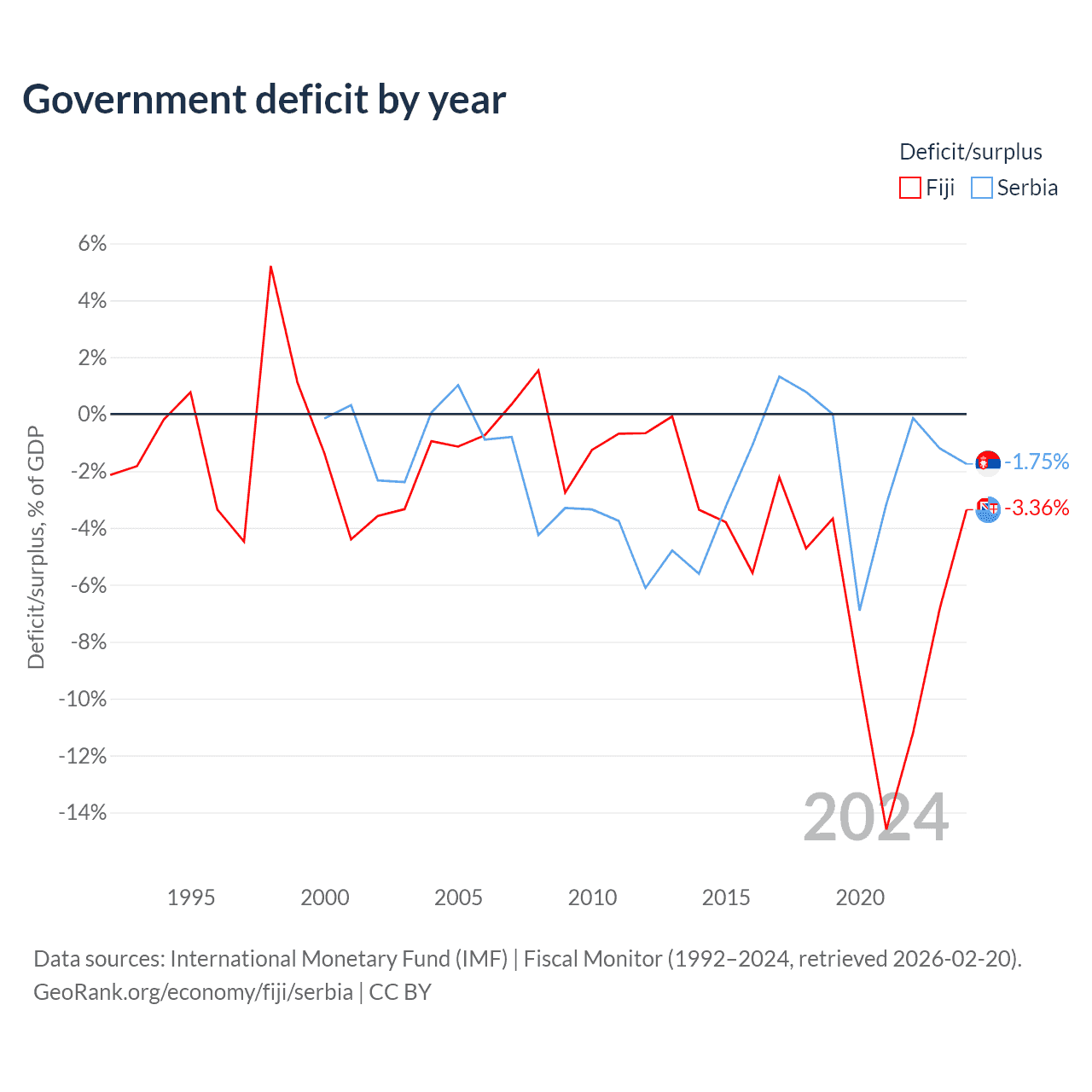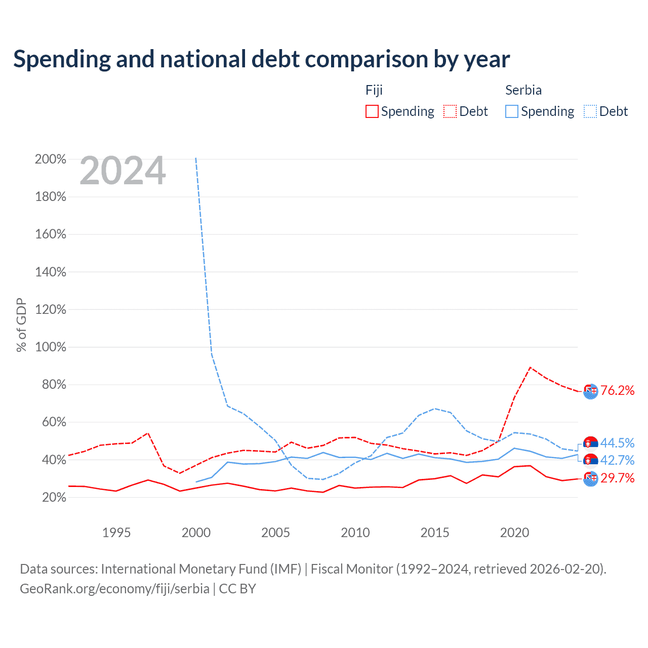 Fiji has $4.54B in government debt (76.2% of GDP), compared to $40.1B (44.5% of GDP) in Serbia.