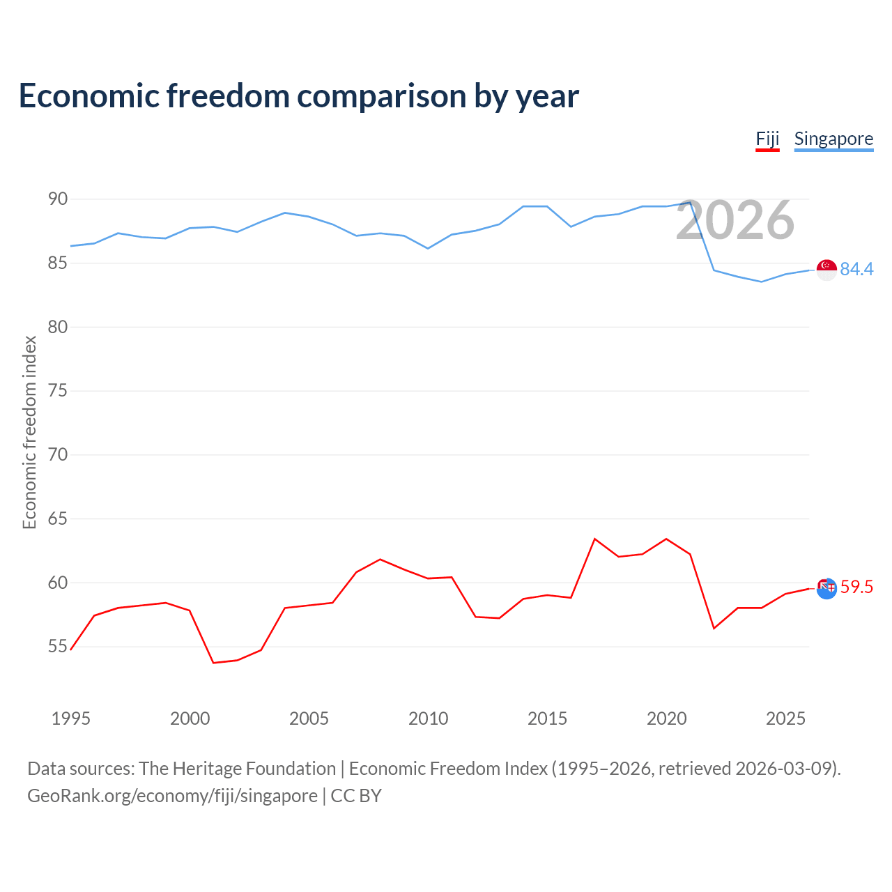 The Economic Freedom Index for Fiji is 59.5, ranking 103/197, compared to 84.4 for Singapore, ranking 1/197. The chart above displays a comparison of annual changes in economic freedom indexes.