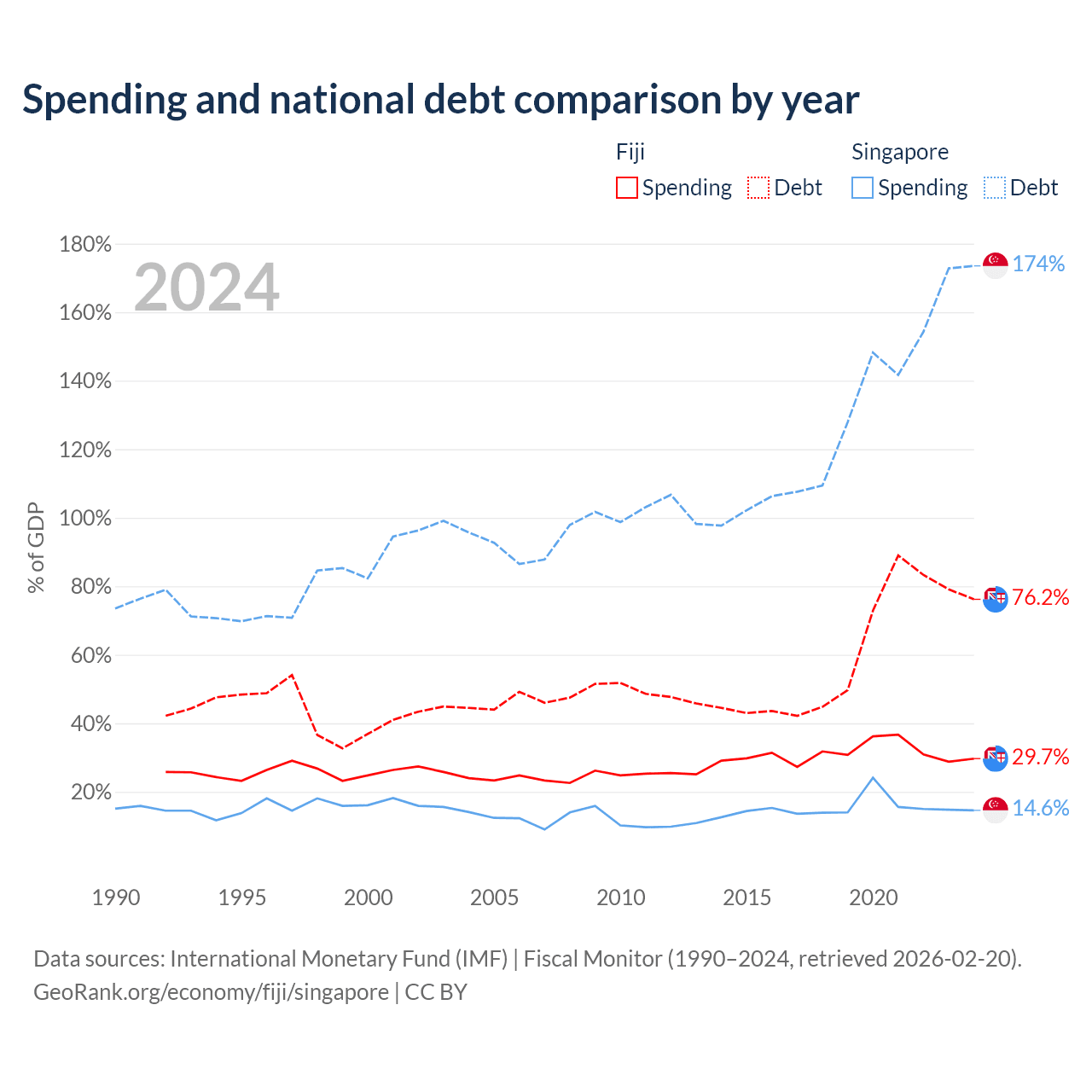 Fiji has $4.54B in government debt (76.2% of GDP), compared to $950B (173.5% of GDP) in Singapore.