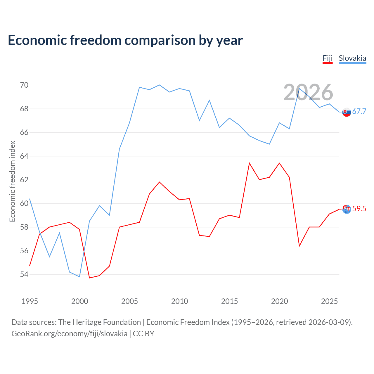 The Economic Freedom Index for Fiji is 59.5, ranking 103/197, compared to 67.7 for Slovakia, ranking 54/197. The chart above displays a comparison of annual changes in economic freedom indexes.
