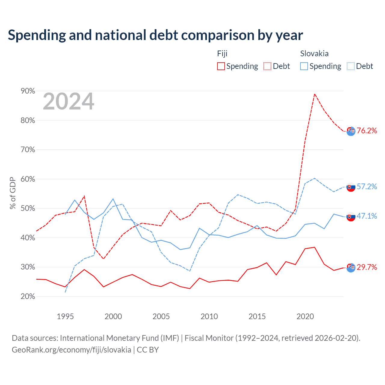 Fiji has $4.54B in government debt (76.2% of GDP), compared to $80.7B (57.2% of GDP) in Slovakia.