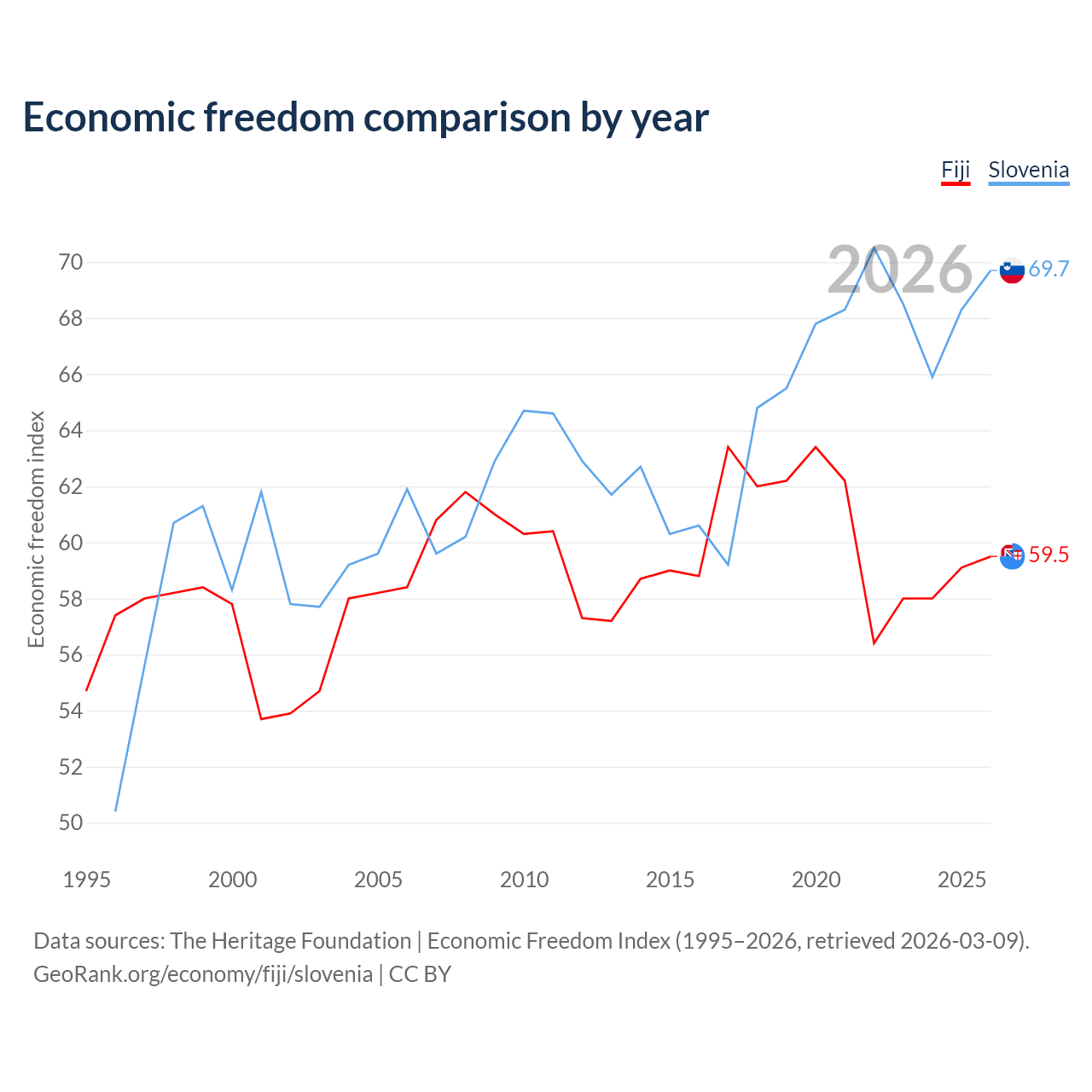 The Economic Freedom Index for Fiji is 59.5, ranking 103/197, compared to 69.7 for Slovenia, ranking 40/197. The chart above displays a comparison of annual changes in economic freedom indexes.