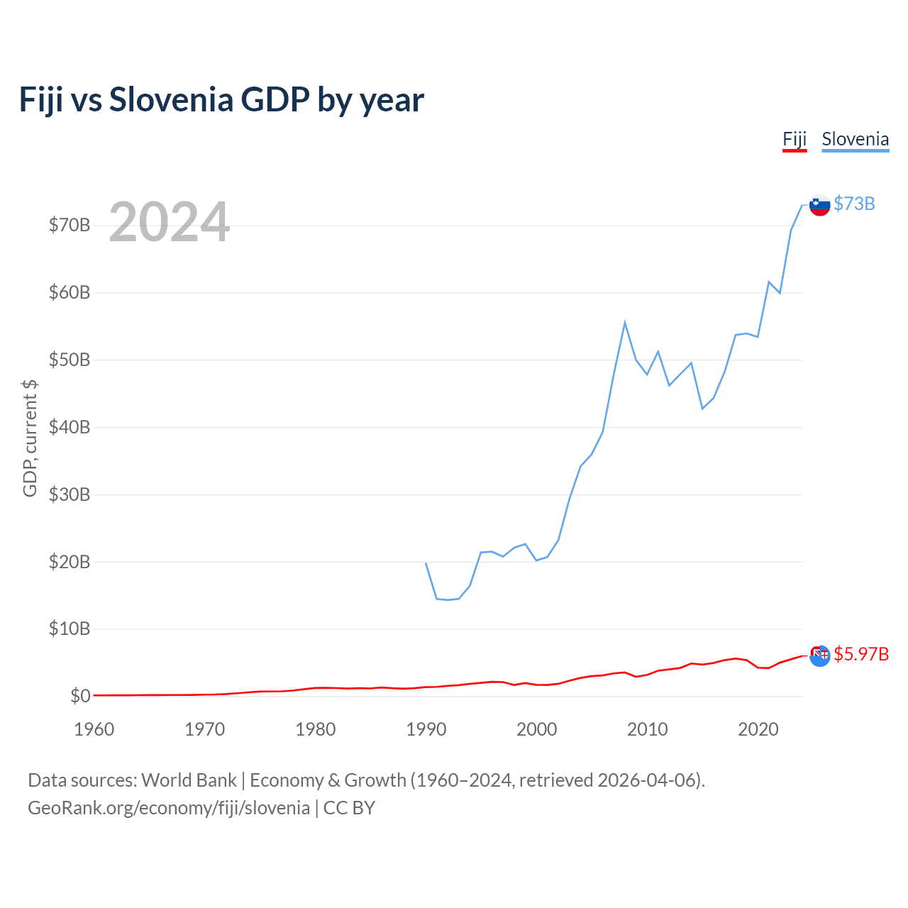 Fiji has a GDP of $5.97B compared to $73B for Slovenia, ranking 161/197 and 86/197 by economy size, respectively.
