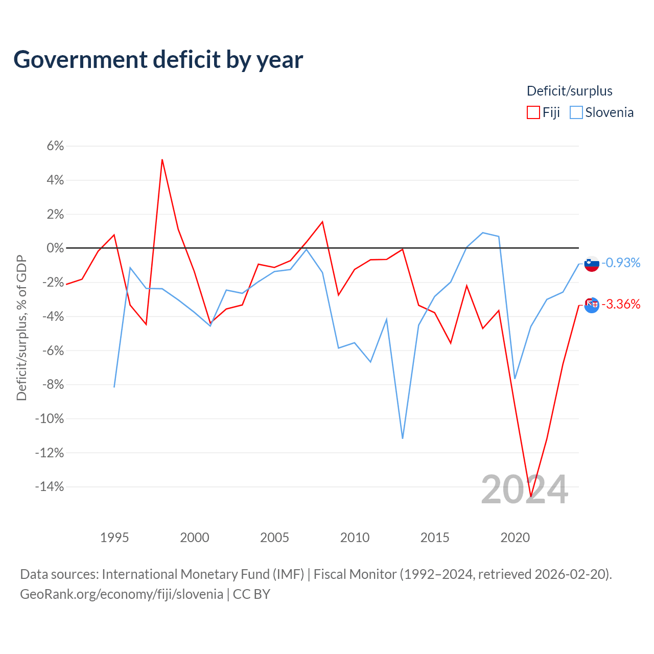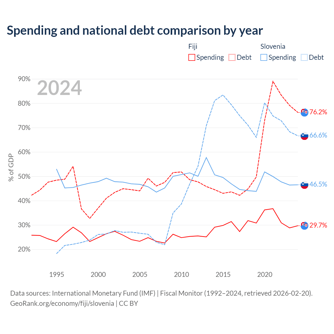 Fiji has $4.54B in government debt (76.2% of GDP), compared to $48.6B (66.6% of GDP) in Slovenia.