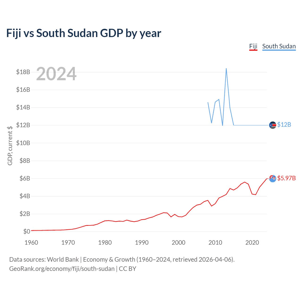 Fiji has a GDP of $5.97B compared to $12B for South Sudan, ranking 161/197 and 149/197 by economy size, respectively.