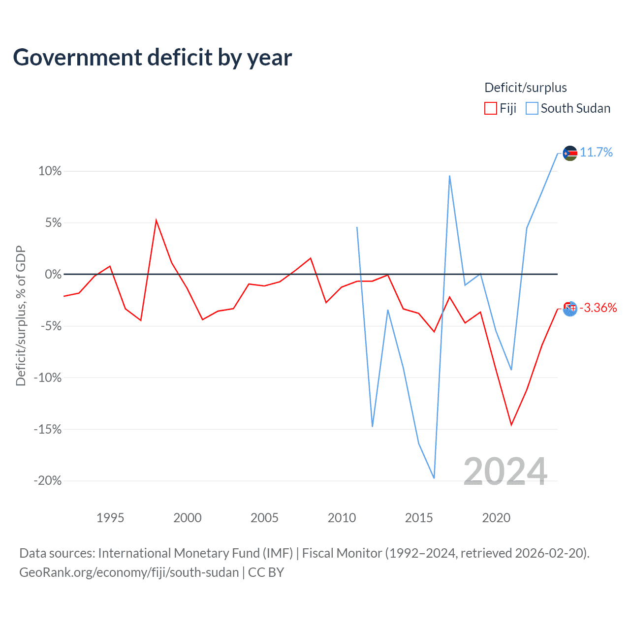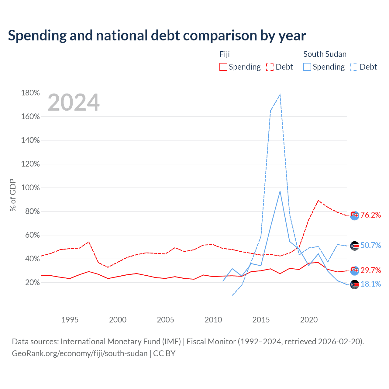 Fiji has $4.54B in government debt (76.2% of GDP), compared to $7.04B (50.7% of GDP) in South Sudan.