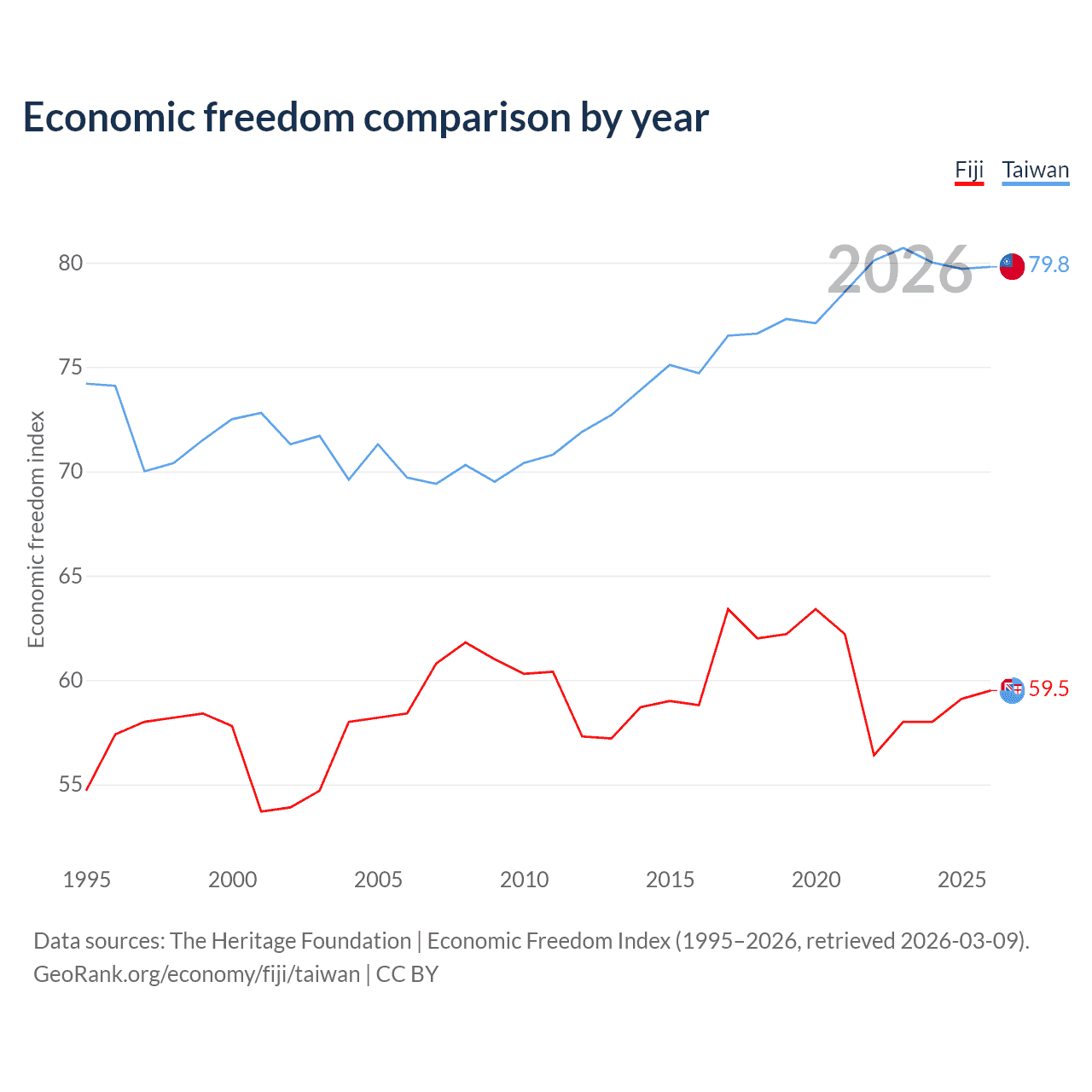The Economic Freedom Index for Fiji is 59.5, ranking 103/197, compared to 79.8 for Taiwan, ranking 6/197. The chart above displays a comparison of annual changes in economic freedom indexes.