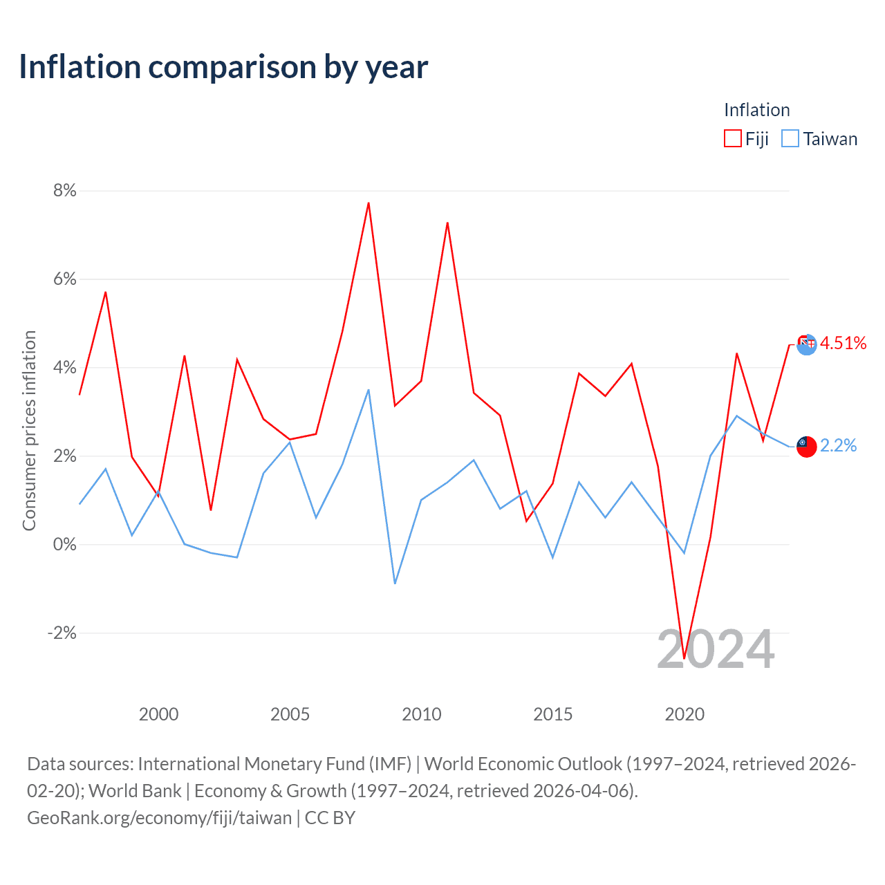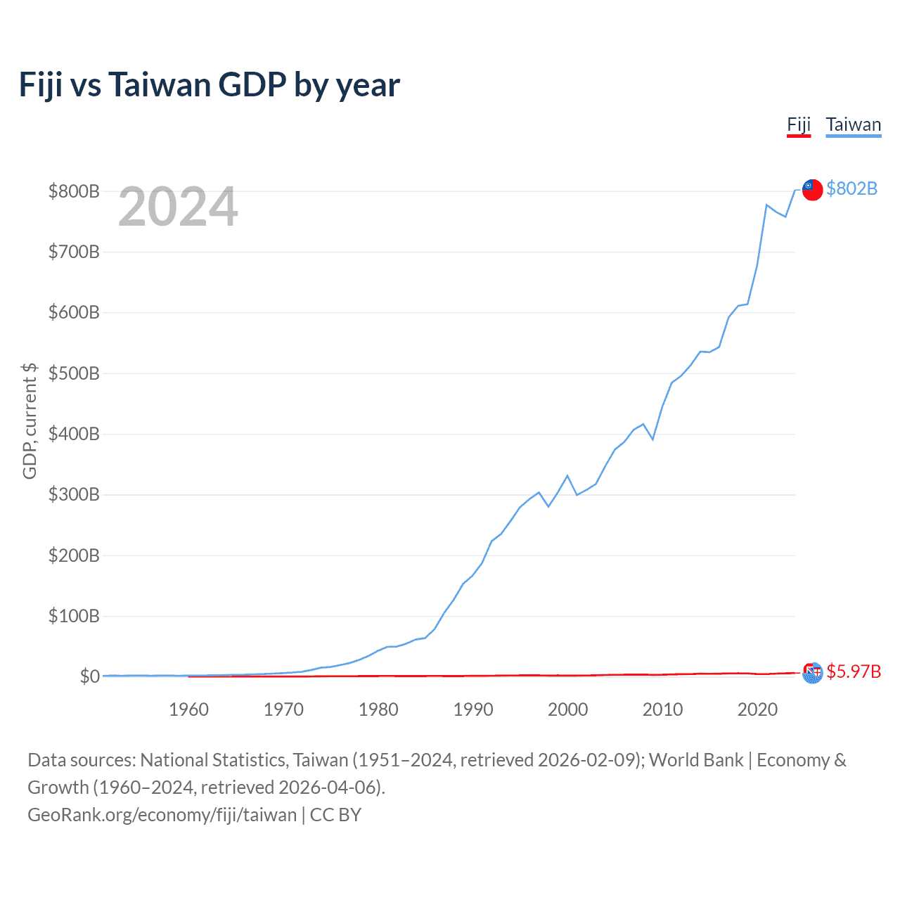 Fiji has a GDP of $5.97B compared to $802B for Taiwan, ranking 161/197 and 22/197 by economy size, respectively.