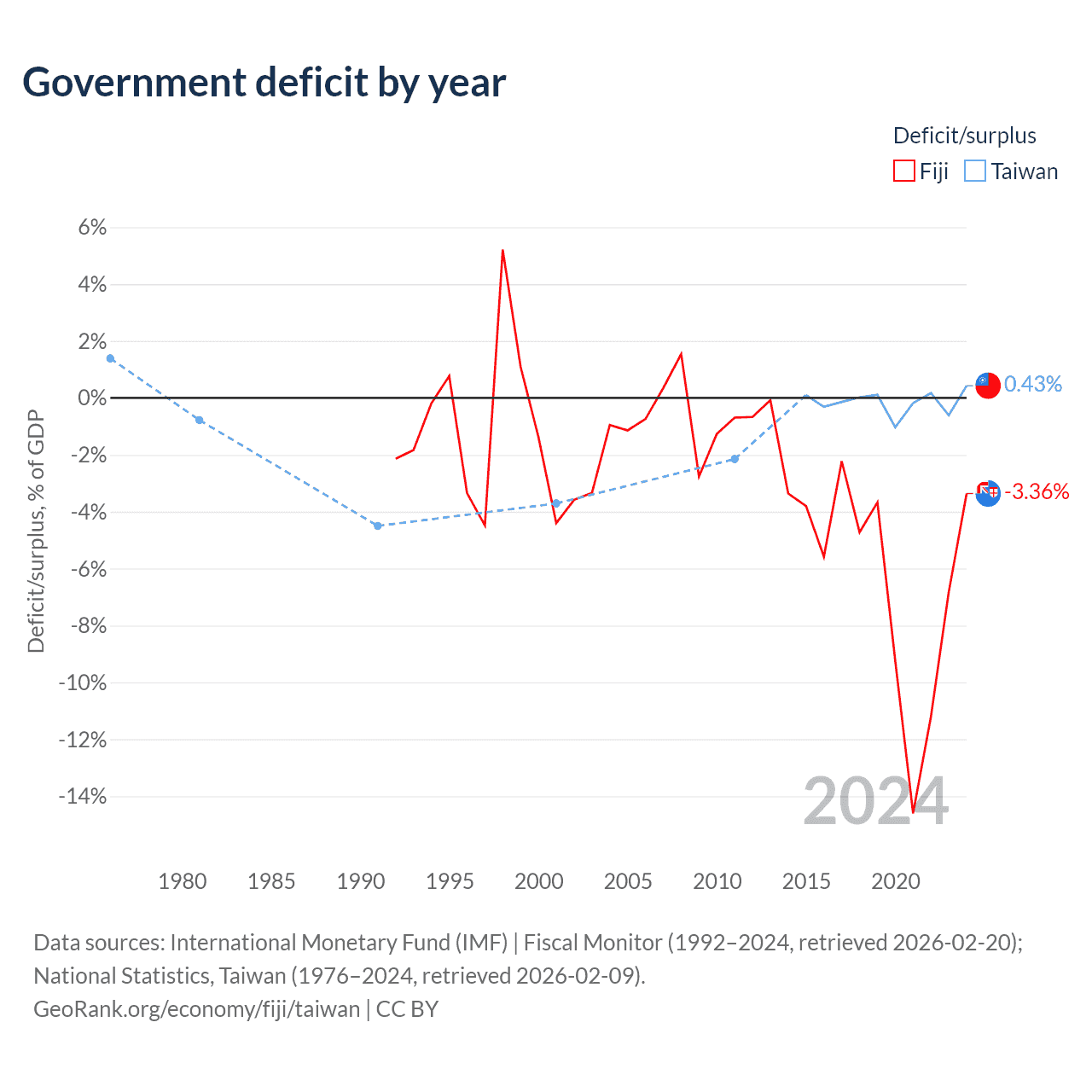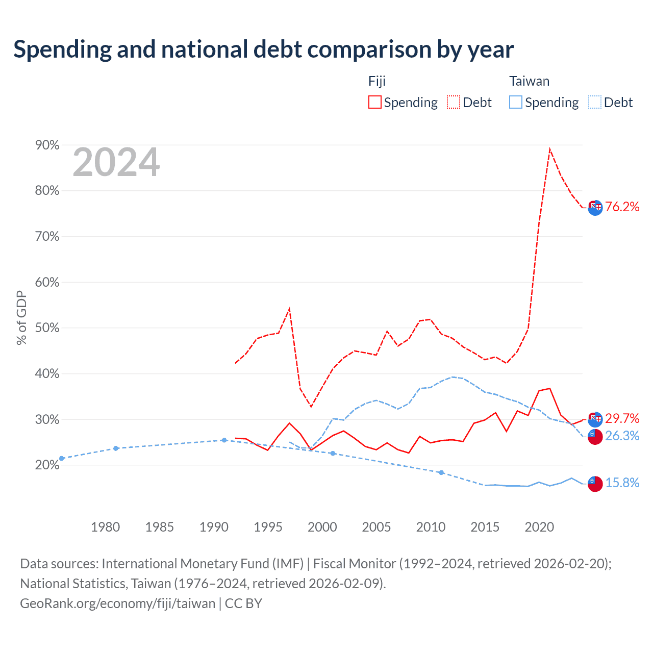 Fiji has $4.54B in government debt (76.2% of GDP), compared to $211B (26.3% of GDP) in Taiwan.