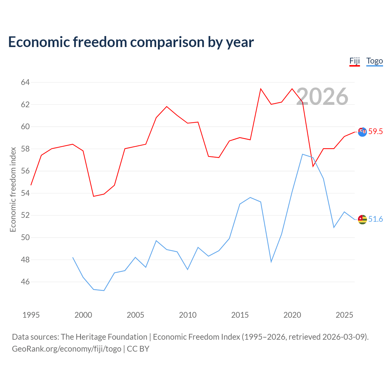 The Economic Freedom Index for Fiji is 59.5, ranking 103/197, compared to 51.6 for Togo, ranking 153/197. The chart above displays a comparison of annual changes in economic freedom indexes.