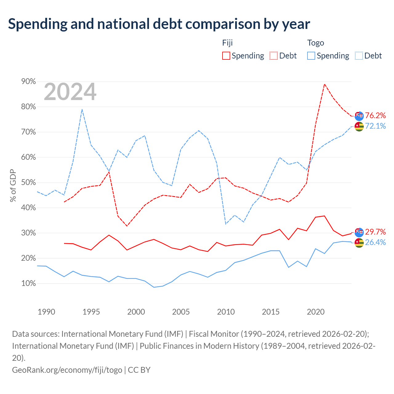 Fiji has $4.54B in government debt (76.2% of GDP), compared to $7.68B (72.1% of GDP) in Togo.